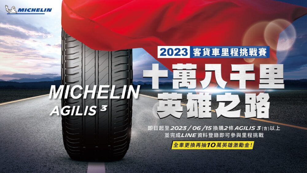 即日起至2023年6月15日,凡換購2條AGILIS 3輪胎(含)以上,並完成LINE資料登錄,即可參與2023「MICHELIN AGILIS 3 十萬八千里英雄之路客貨車」里程挑戰賽。全車更換(全車四條/全車六條),並完成LINE資料登錄再抽10萬英雄激勵金!詳情請上米其林官方LINE查詢https://lihi2.com/8AeuM。