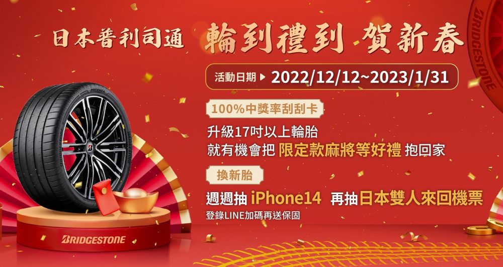即日起到2023年1月31日活動期間內,於全台普利司通輪胎經銷商購買四條日本普利司通轎車/休旅車胎不限花紋、不分尺寸並加入Line好友,即有機會抽中日本雙人來回機票、iPhone14、tokuyo肩頸按摩器等新春好禮, 購買17吋以上輪胎登錄再送100%中獎刮刮卡一張(數量有限送完為止)