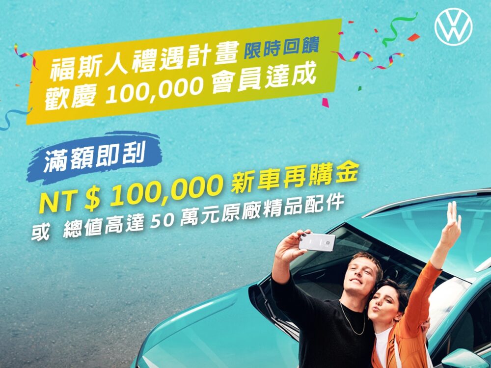 自2020年「福斯人禮遇計畫」推出至今,總人數已突破10萬,締造歷史新高。因此6月1日起至7月31日止,凡車主回廠消費折扣後滿NT$10,000或里程超過10萬公里,可獲刮刮卡乙張,獎項包括NT$100,000新車再購金,以及總價值高達50萬元原廠精品配件,而自費消費每滿NT$10,000可再得刮刮卡乙張,以此類推。
