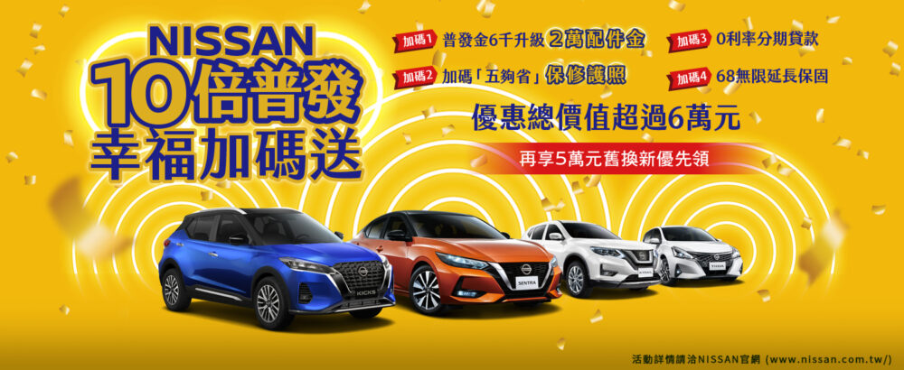 裕隆日產汽車為響應政府推出全民共享經濟成果普發現金政策,並實質回饋廣大支持愛護NISSAN的消費者,自4月1日起至4月28日止,限時推出「NISSAN 10倍普發 幸福加碼送」購車優惠專案,凡於優惠期間購買NISSAN國產全車系,即可享有普發金6千元升級2萬元配件金,加碼再贈「五夠省」保修護照、0利率分期貸款、68無限里程延長保固等超值購車優惠,總價值超過6萬元,更可享5萬元舊換新優先領,讓消費者幸福入主NISSAN優質車款。