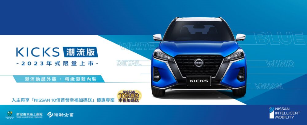 為滿足消費者追求與眾不同的個性化需求,NISSAN自2月24日起限量推出300台KICKS「潮流版」,以亮眼的白頂狂藍專屬全新車色為基底,再運用強化視覺外型的動感擾流尾翼、酷黑17吋鋁圈及酷黑車頂架,打造潮流動感外觀;並追求細節質感,採用精緻潮藍內裝,包含潮藍D-Shape方向盤、潮藍3D紓壓皮椅、潮藍絨毛腳踏墊及精裝壓印頭枕,展現獨特潮流魅力,外觀及內裝極具視覺特色,配備升級不加價,還可搭配「NISSAN 10倍普發 幸福加碼送」限時購車優惠,NISSAN KICKS「潮流版」限量上市熱銷中,即將售罄,敬邀消費者欲購從速。