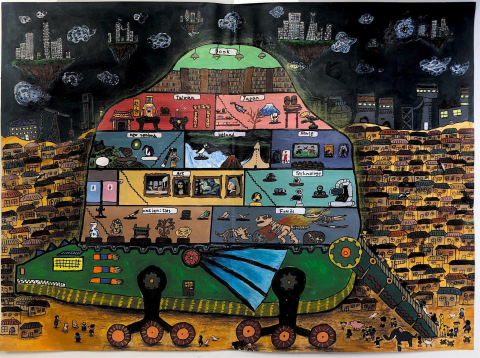 榮獲C組金獎的黃芩同學以《乘載夢想的世界展覽車》為主題,透過它可以抵達貧窮沒有資源的地方,帶給人們關於現在、過去、未來的有趣知識,是台乘載滿滿夢想的車輛。評審義大利波隆那插畫獎得主陳又凌老師稱讚這幅作品充滿許多小細節,會讓人想在這幅畫中耐心尋寶。
