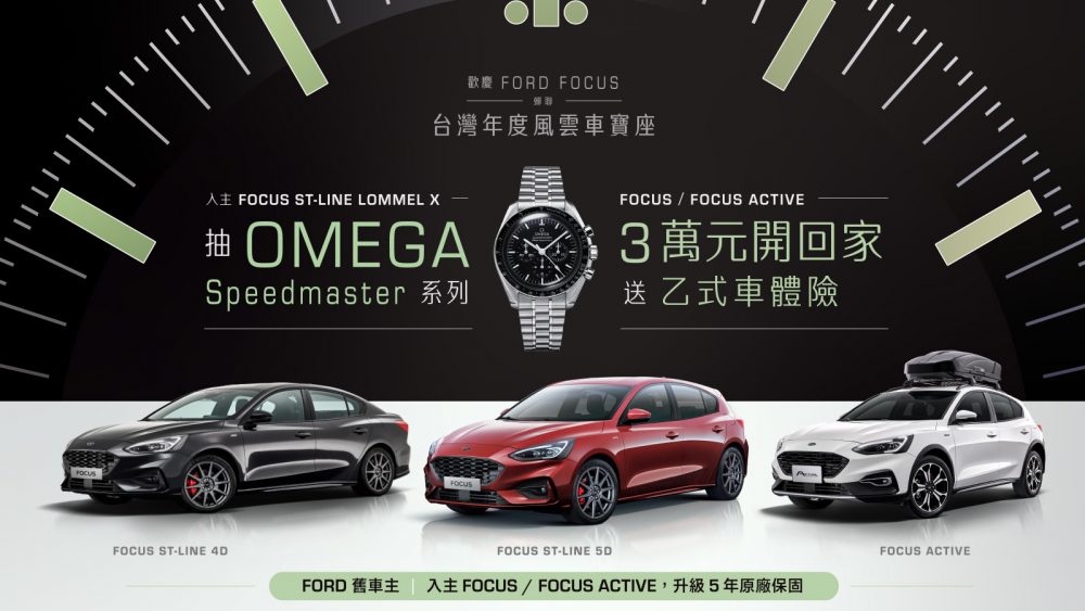 歡慶Ford KUGA 23年式銷售破千台及台灣風雲車肯定 一月入主Ford享優惠Ford車款以先進智慧與安全科技結合駕馭樂趣,廣受消費者喜愛,人氣指標包含:Ford FOCUS及KUGA均榮獲消費者肯定,榮登台灣年度風雲車。為回饋消費者,福特六和推出限時優惠,於活動期間2023年1月1日至1月31日,入主Ford FOCUS ST-Line Lommel或Ford KUGA ST-Line即可具備「OMEGA Speedmaster登月錶」抽獎資格(價值$237,000)。