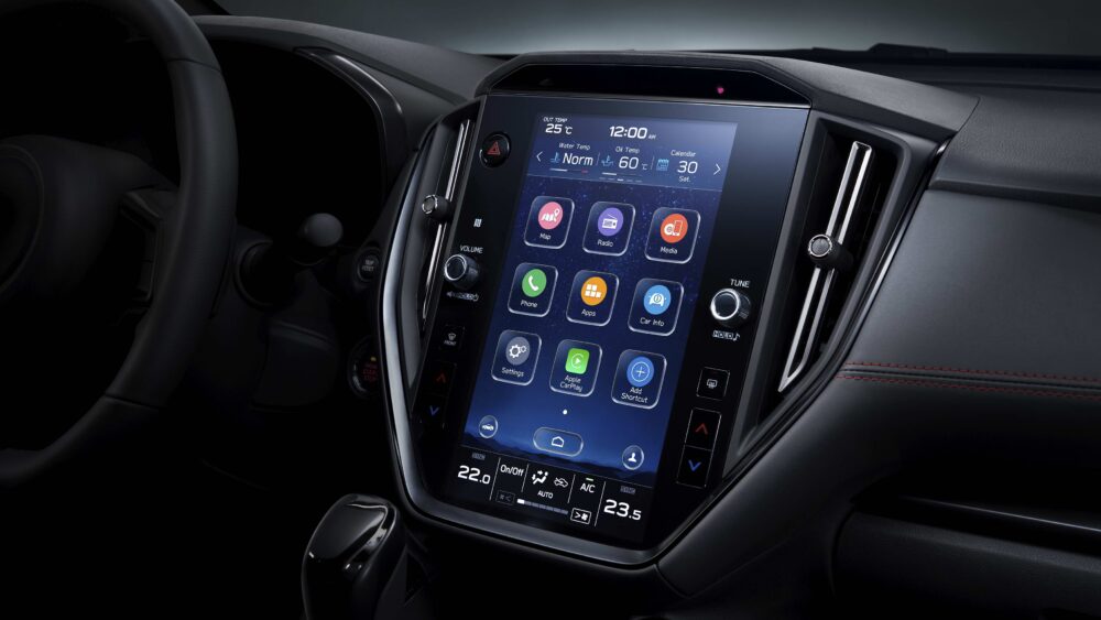 而內裝佈局亦全面刷新感官,不僅以極具熱血速度感的紅色車縫線鋪陳,更融入賽車元素且有性能代表STI字樣的D型皮革方向盤,並導入科技感十足的11.6吋的智慧影音觸控螢幕,以更直覺化的介面設計提供Apple CarPlay、Android Auto等實用便利的行動裝置連線功能。