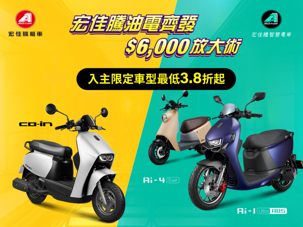 響應政府普發6,000元現金措施,宏佳騰祭出優惠購車放大術,油電齊發加碼釋出超優惠購車福利,讓消費者輕鬆入主宏佳騰全車系優質新車。其中在電車優惠方面,深受市場熱烈迴響的「Ai-1車系加碼最多可折9,000元」、「搭配政府舊換新最高現省38,800元」、「Ai-2 Gather送24個月電池資費折抵0元起及專用前置物籃」等優惠方案好評延長至5/15外;針對宏佳騰MY150全車系及CO-IN等油車車款更祭出優惠自由選方案,以限時最高加碼折萬元的超狂現金購車折扣,提供消費者輕鬆入主的絕佳彈性購車方案。