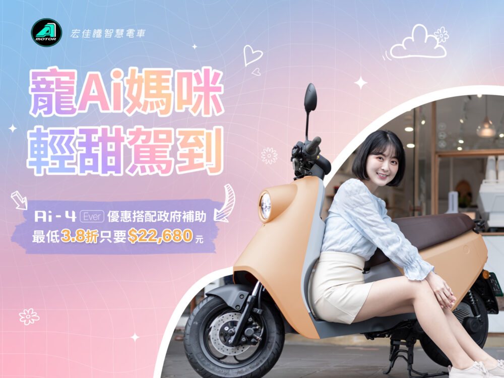 宏佳騰智慧電車持續深化用車版圖,拓展車主受眾面向。當中專為女性車主量身打造的綠牌優雅電車Ai-4 Ever,是質感媽咪首選,清甜簡約外型,輕巧好駕馭,沒有排氣管,免去小朋友燙傷的擔憂,沒震動、沒噪音,零排放,讓每次出門都清新優雅。即日起至5/15止,限時入主更可加碼二輪市場同級車最高回饋購車金6,000元,搭配政府汰舊換新最高29,800元補助優惠及現金購車再送1,500元購車金等多重優惠。最低達3.8折的專屬「寵Ai媽咪方案」,讓消費者能最低以22,680元的親民售價輕鬆坐擁全能綠牌電車Ai-4 Ever。