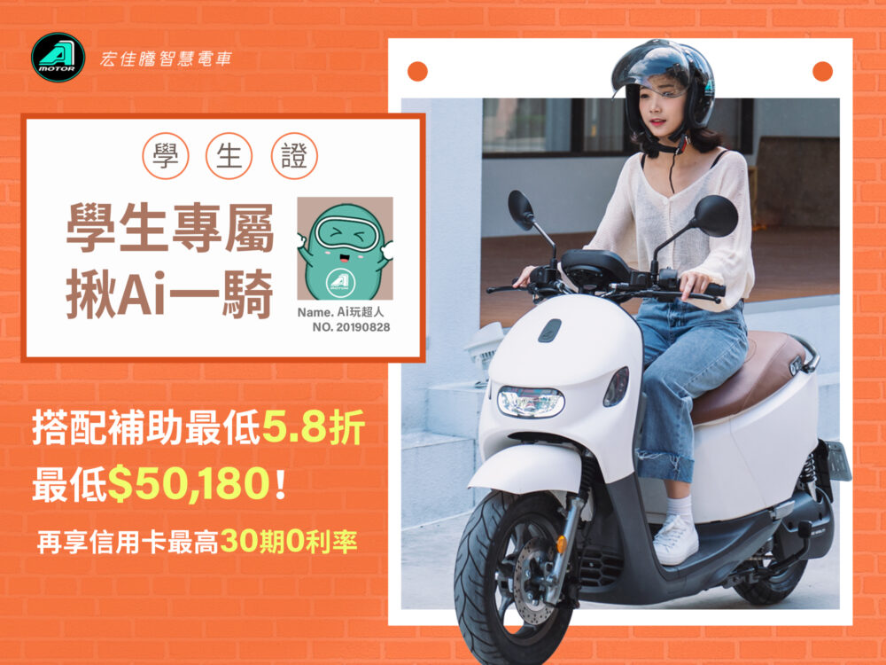 針對學生族群,即日起至5/15止,消費者只要持學生證入主宏佳騰智慧電車,搭配政府補助最低入手價5.8折,新車最低只要50,180元。指定車型Ai-1 Ultra Belt、Ai-1 More、Ai-3 More,更可享最高6,000元現金折扣,以及總價值最高達4,920元的「多功能Y型架、輕量化鋁合金腳踏墊、極簡風飾桿」的原廠精品大禮包。新學期新氣象,就讓宏佳騰智慧電車陪伴你「換上好新騎」!