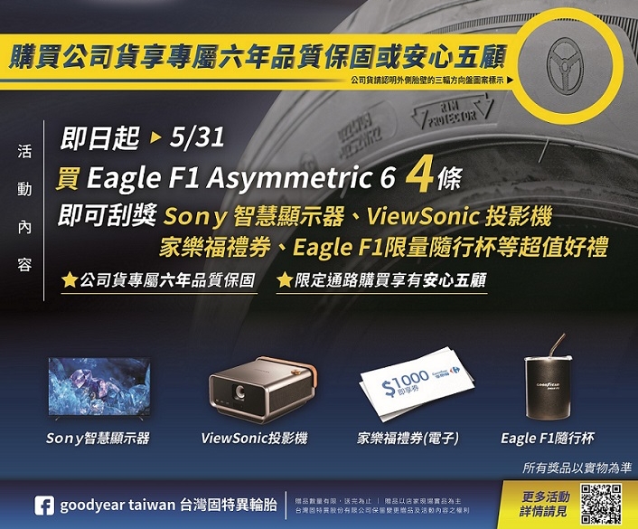 即日起至5月31日,凡購買4條Eagle F1 Asymmetric 6還可參加限定刮獎,有機會刮中SONY智慧顯示器、ViewSonic投影機、家樂福禮券、Eagle F1隨行杯等超值好禮,更多活動詳情請洽台灣固特異官網活動介紹。