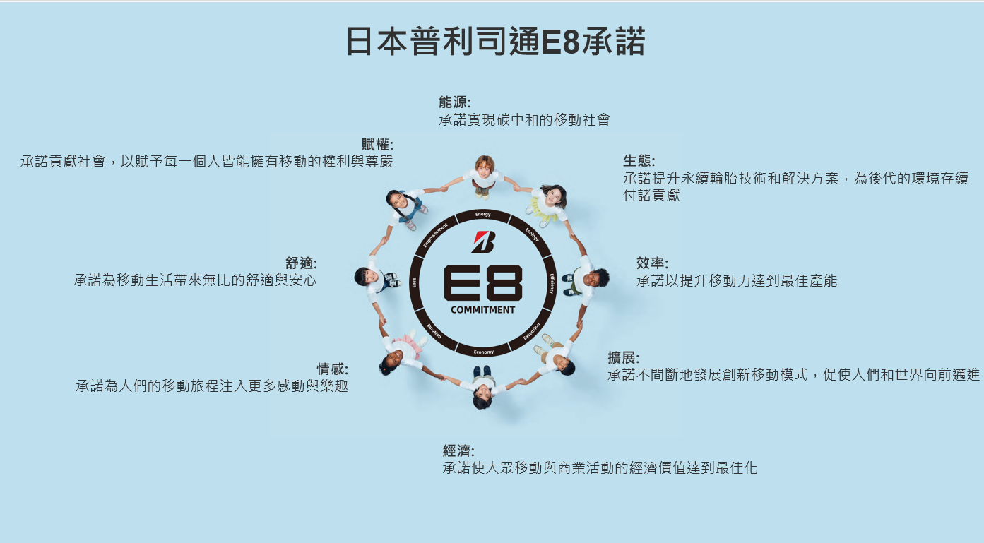 日本普利司通秉承「以最高品質貢獻社會」的使命,不斷擴大並發展業務,以滿足社會不斷變化的需求,並繼續支持每一個人的移動與生活方式;在2022年創立91周年之際,日本普利司通對外宣布邁向2030年的E8承諾。由 8 個代表企業的價值觀所組成,以字母E為開頭(Energy 能源、Ecology 生態、Efficiency 效率、Extension 擴展、Economy 經濟、Emotion 情感、Ease 舒適、Empowerment 賦權),集團將致力於透過能代表日本普利司通的目標和歷程,與員工、社會、合作夥伴及客戶一同實現永續發展的社會,亦將持續透過促進汽車行業和營運服務的轉型,力求給予消費者既專業又安心的服務。