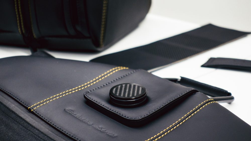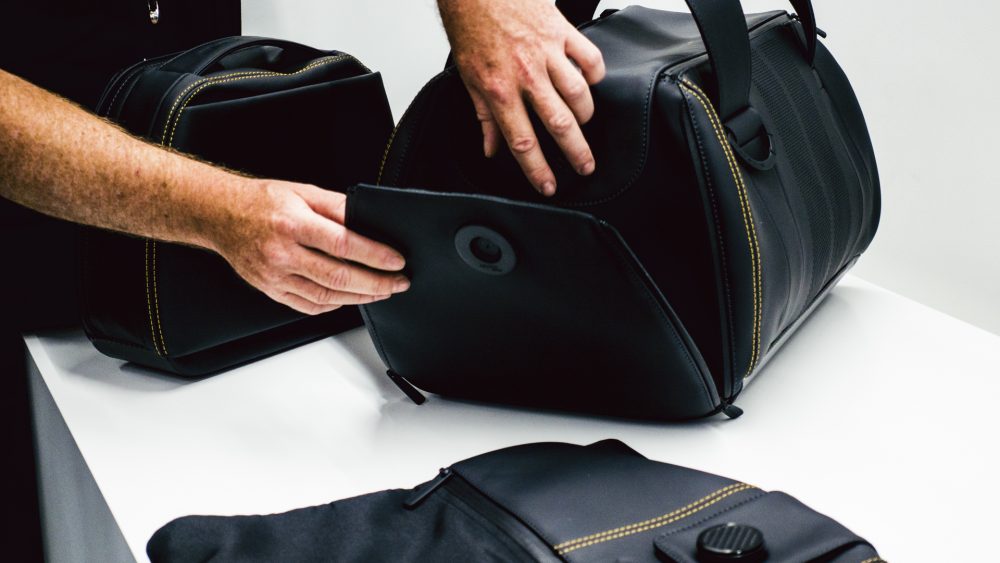 我們做了一套行李皮件組。一樣圍繞在主題的金黃雙生條紋,採用軟袋設計:公事包、大中小旅行包,採四件組,並且可以組合再一起成為一個大手提行李,且恰好的符合“911 Turbo S Exclusive”的行李箱,這樣的設計也可避免行李分散而翻滾,肩背帶採用與安全帶相同的材質,包包的皮革也是採用與車內同樣的皮革,縫線處可改為銀色縫線,此外,“Porsche”還特地找了一家小型縫紉廠,只為了將“Porsche”字樣縫上。
