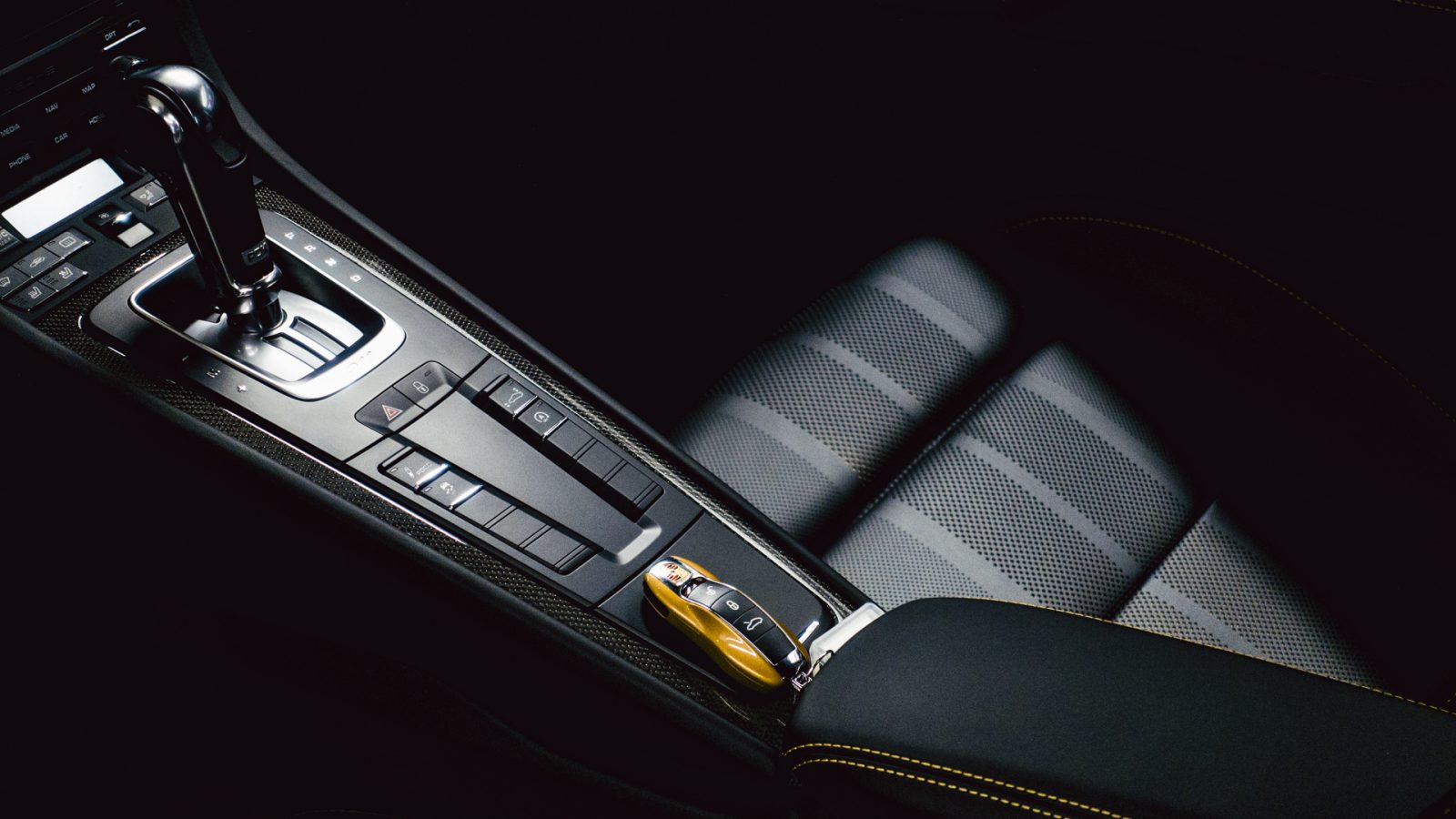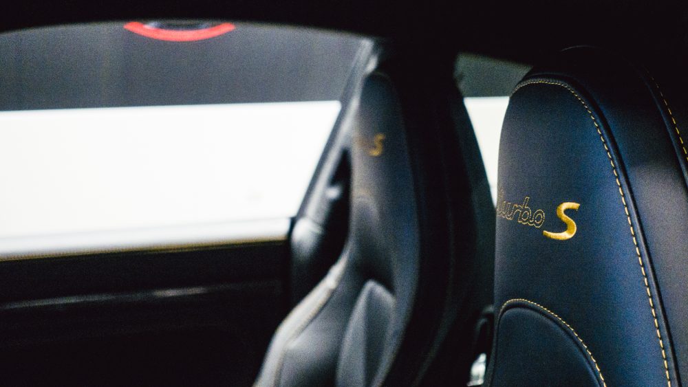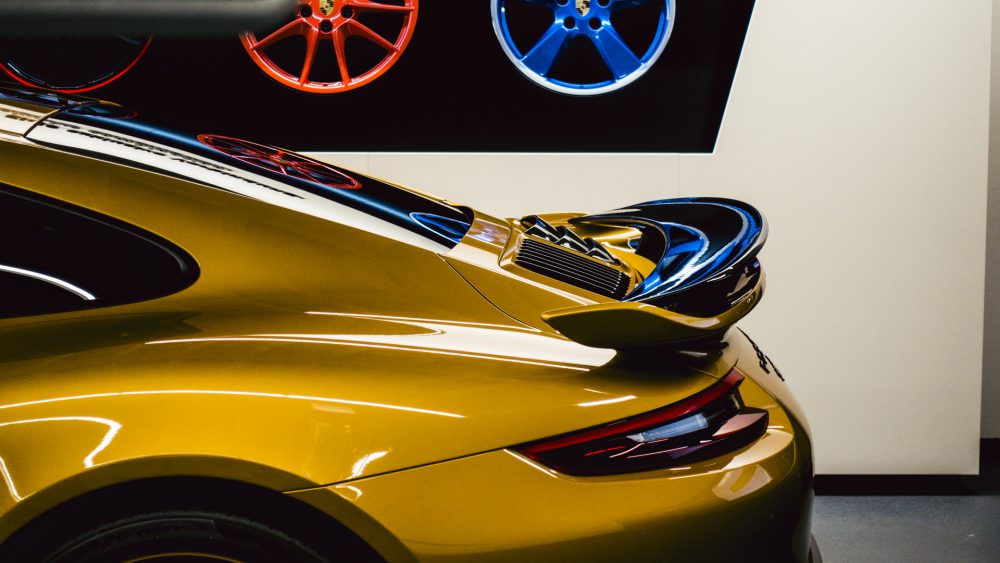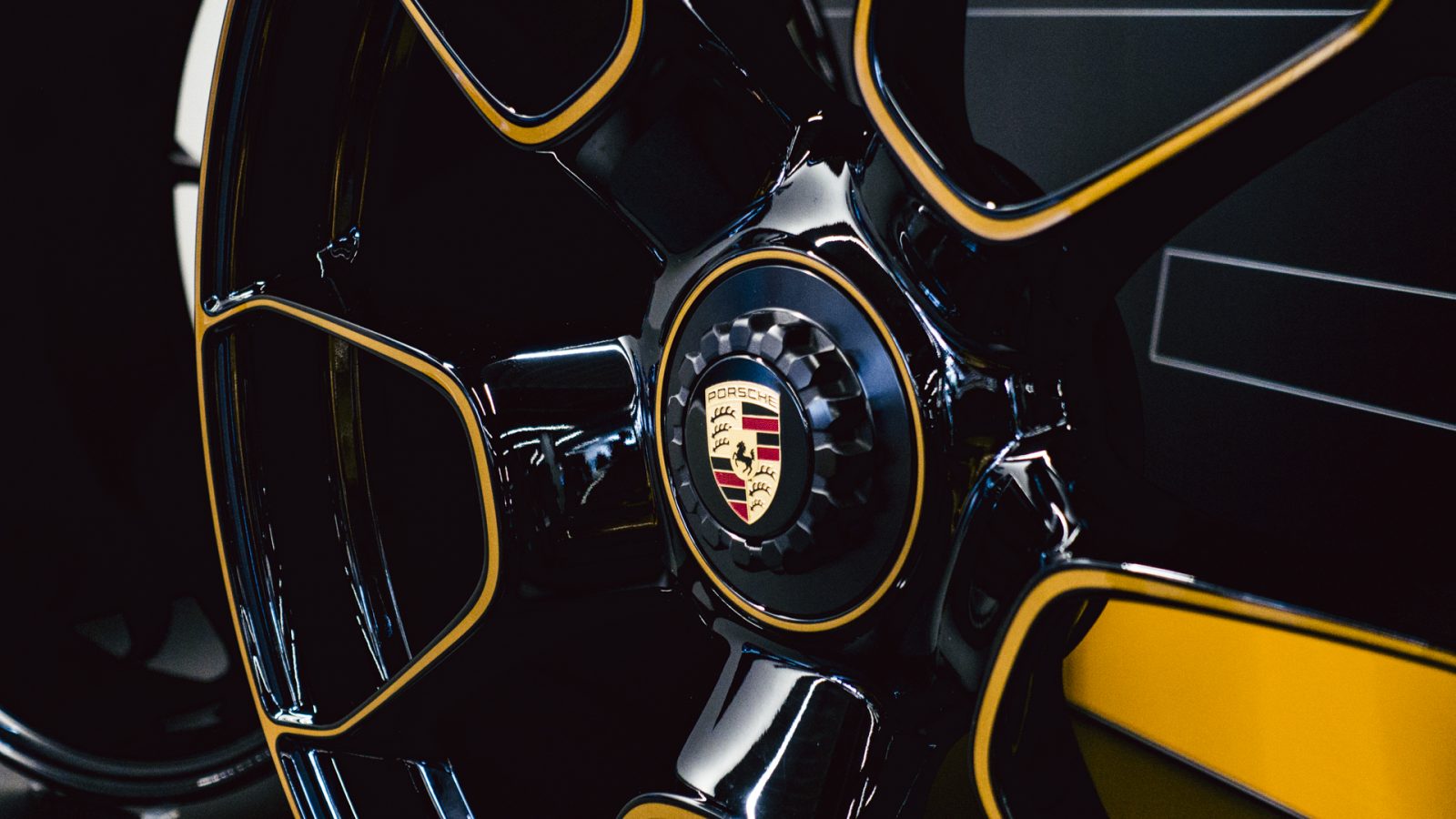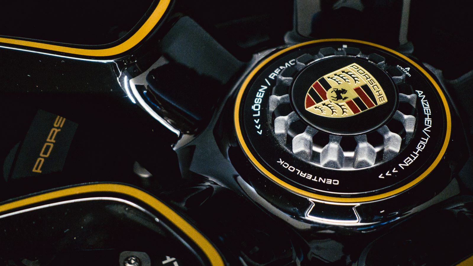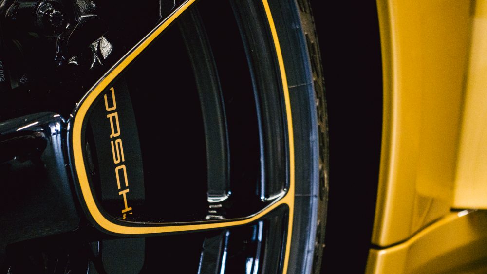看看人家的腰嘛。從側邊觀看,由下到上從濃金黃色到淡金黃色,後照鏡則是鑲上碳纖維,這個地方會考,很重要,拿起你們的螢光筆,金黃線條交融在黑色鋁圈間,這可不簡單,透過三層塗裝,第一層考上金黃色,再以黑色烤漆覆蓋為第二層,最後一層使用雷射雕刻把金黃線條雕製出來,關於最後一道工法的雷射雕刻,每雕刻一個鋁圈就得花上一個小時,何不意氣風發呢?在鋁圈內的卡鉗為黑色烤漆印上“Porsche”字樣,整體外觀不頗有皇帝之姿嗎?