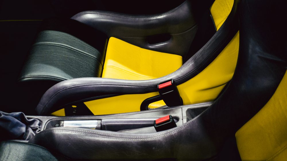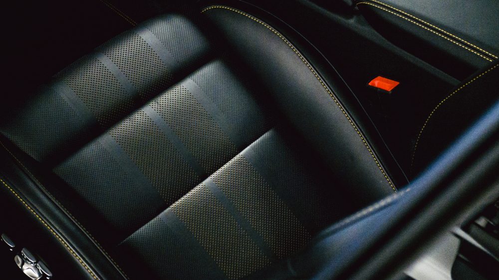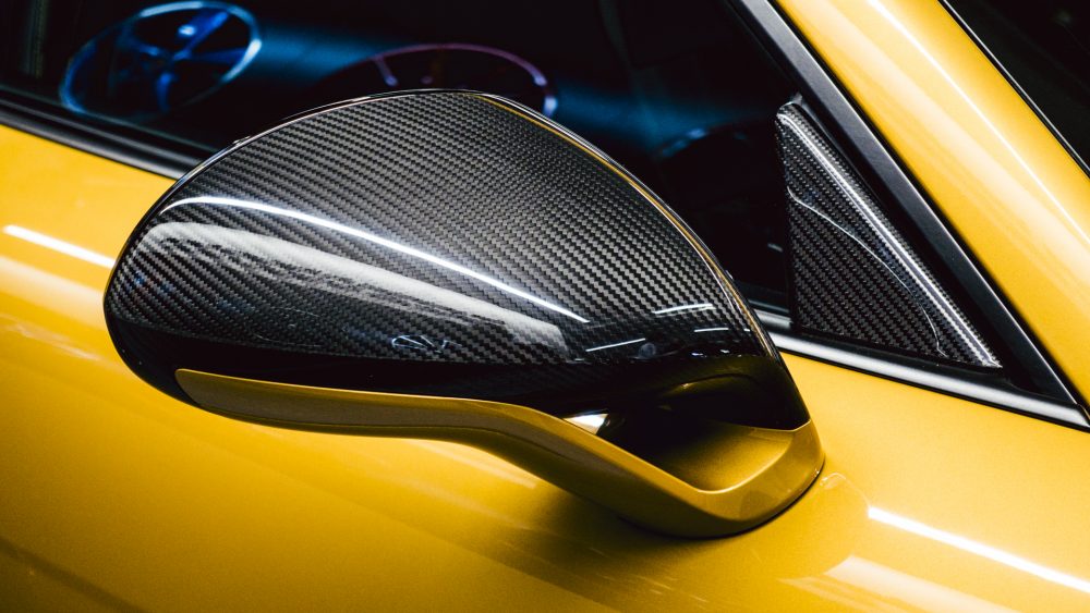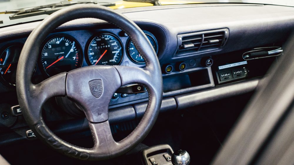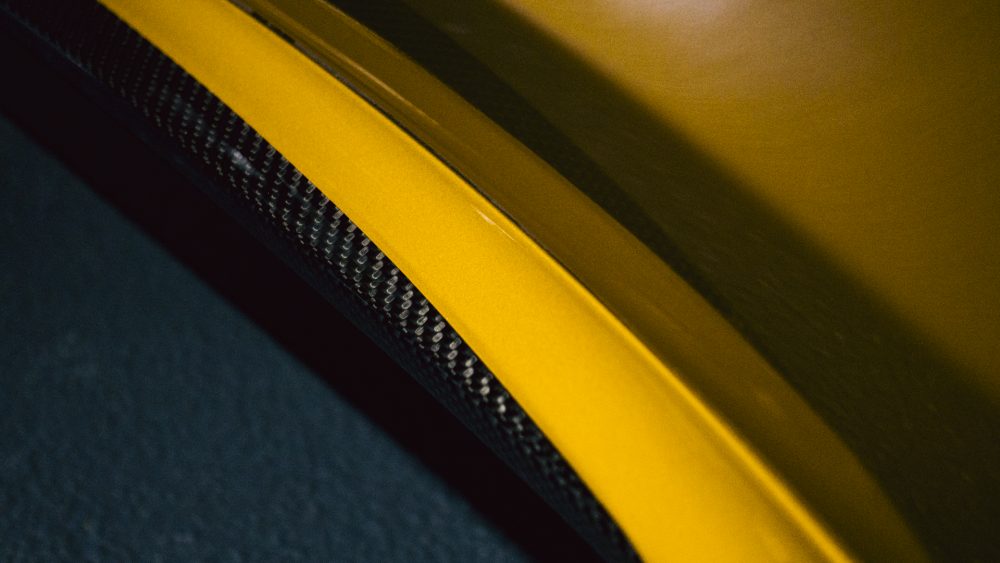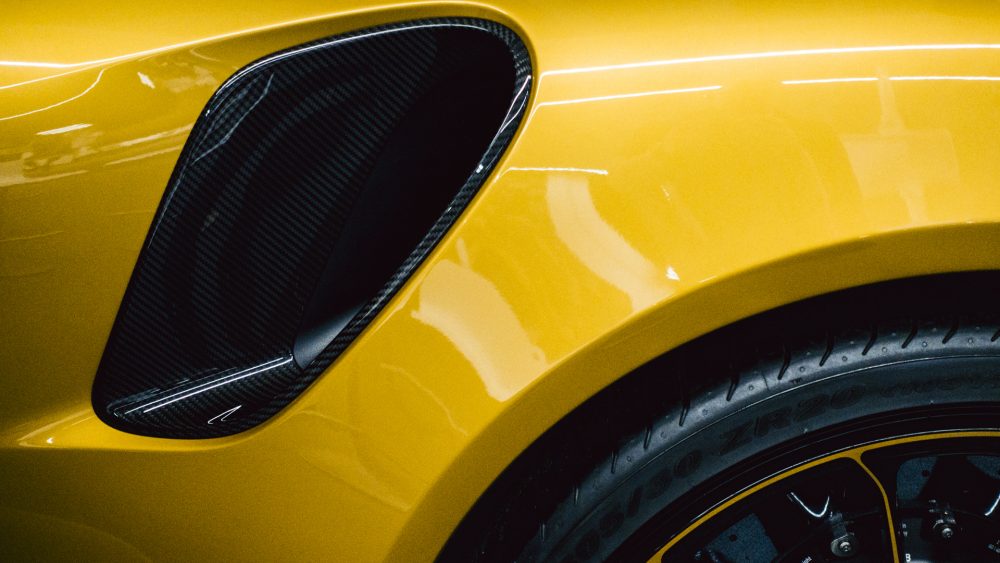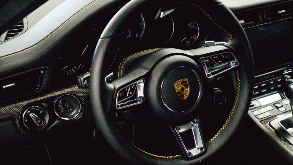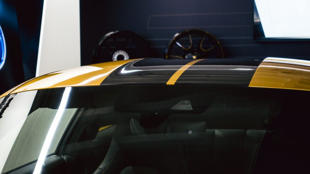 看看人家的腰嘛。從側邊觀看,由下到上從濃金黃色到淡金黃色,後照鏡則是鑲上碳纖維,這個地方會考,很重要,拿起你們的螢光筆,金黃線條交融在黑色鋁圈間,這可不簡單,透過三層塗裝,第一層考上金黃色,再以黑色烤漆覆蓋為第二層,最後一層使用雷射雕刻把金黃線條雕製出來,關於最後一道工法的雷射雕刻,每雕刻一個鋁圈就得花上一個小時,何不意氣風發呢?在鋁圈內的卡鉗為黑色烤漆印上“Porsche”字樣,整體外觀不頗有皇帝之姿嗎?