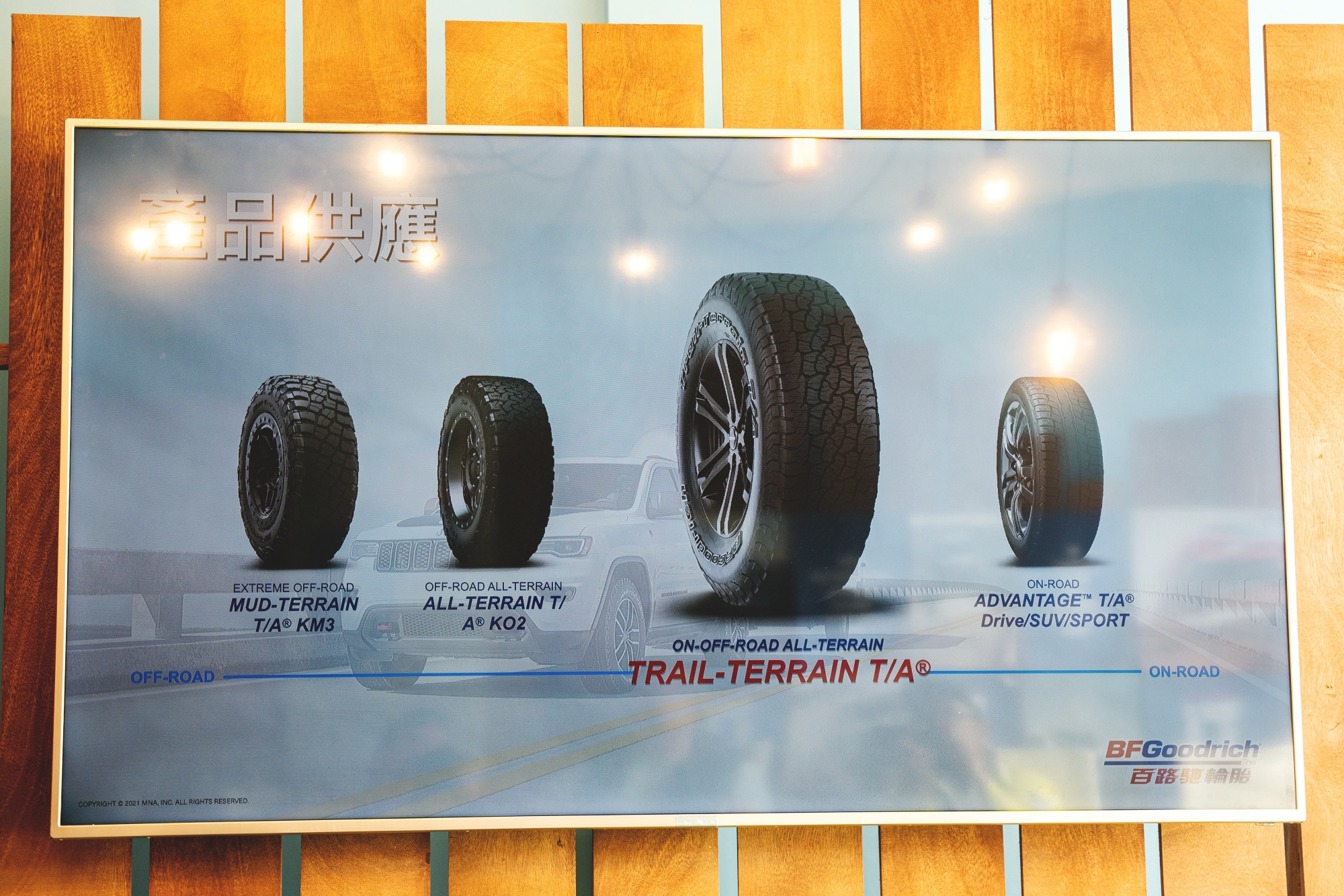 而在2017年回歸台灣市場後,如All-Terrain T/A KO2全地形越野胎和Mud Terrain T/A KM3極限越野專用胎以及街道都會的Advantage T/A Drive乘用轎車胎、Advantage T/A SUV休旅車胎等,也都持續在台灣越野市場中作為指標性商品的存在。