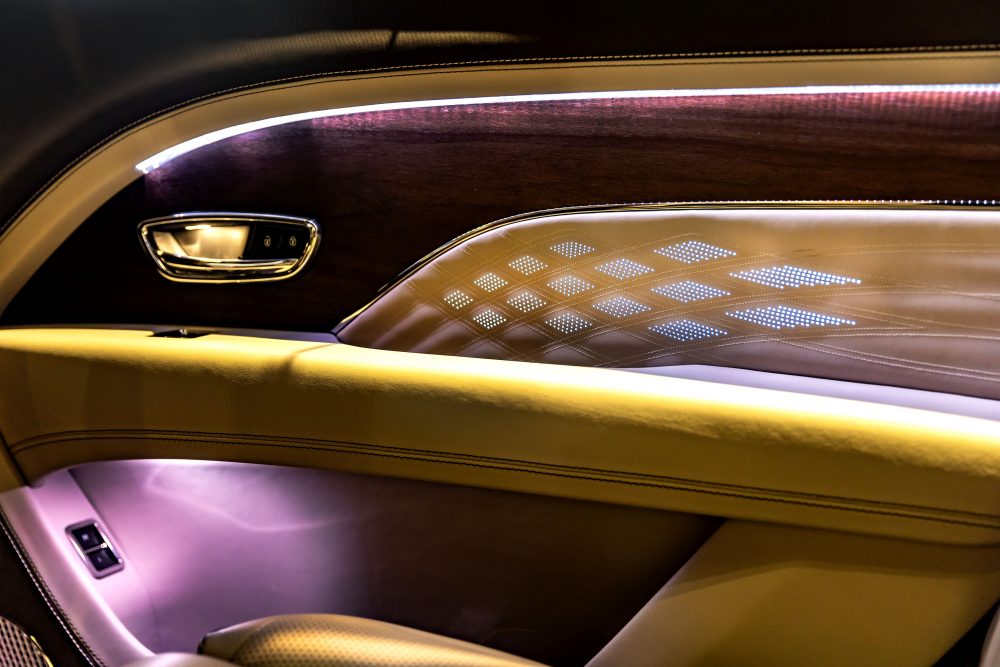 BENTAYGA EWB擁有最先進的車室絎縫圖紋,結合數位化的工藝技術,精緻對稱的鑽石型菱格紋在椅面肩部優雅呈現,頂級皮革格紋中更綴以直徑小於1 mm的細孔,跳脫以往的現代設計在車門面板與室內空間延續整體性。在儀表木飾及車門細節上,BENTLEY工匠巧妙融入僅厚0.07 mm的金屬飾紋鑲嵌,展現亙久彌新的極致手工藝成就。