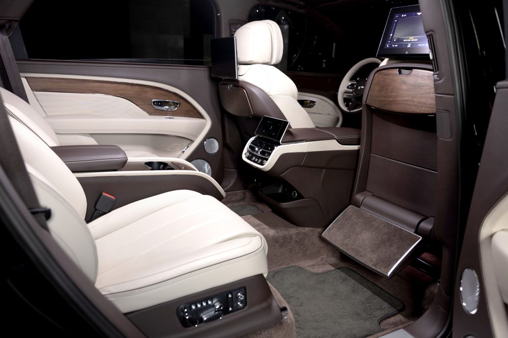 全新開發BENTLEY航空座椅套件可搭配4+1座或4座配置,多達22向調整功能之餘,在紓壓模式下座椅會以最大40度傾斜椅背,並自動展開地毯與皮革綴飾的休憩置腳踏板,僅需透過後座觸控多功能遙控螢幕即能輕易轉換不同場景。主動式控溫座椅科技將偵測乘客體溫及濕度,進而判斷該開啟加溫或通風功能,全新開發的腿部與肩部椅墊並新增額外側邊包覆,多達177種個別變化。