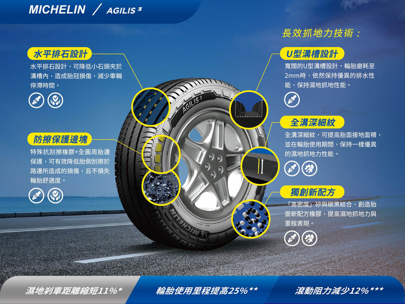 秉持著米其林「優異性能直到最後一里」的品牌理念,米其林輪胎的傑出性能,不因時間而遞減,除了低扁平比輪胎,在廂型車及小型商用車市場中,MICHELIN AGILIS 3系列產品,更以安全、耐磨及耐用的卓越表現,廣受運輸物流、消費者的好評,突破性的三項創新設計「U型溝槽」、「全溝深細紋」及「創新橡膠配方」,不僅帶來更穩定更安全的駕車體驗,高里程的輪胎及專利防護技術,更能有效替車主創造加乘收益、降低維修成本等,是一款無論商用或家用,都最有感的「高CP」胎款選擇。
