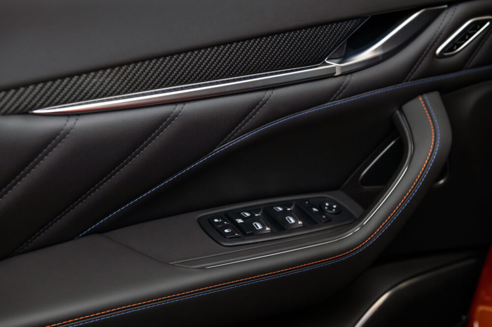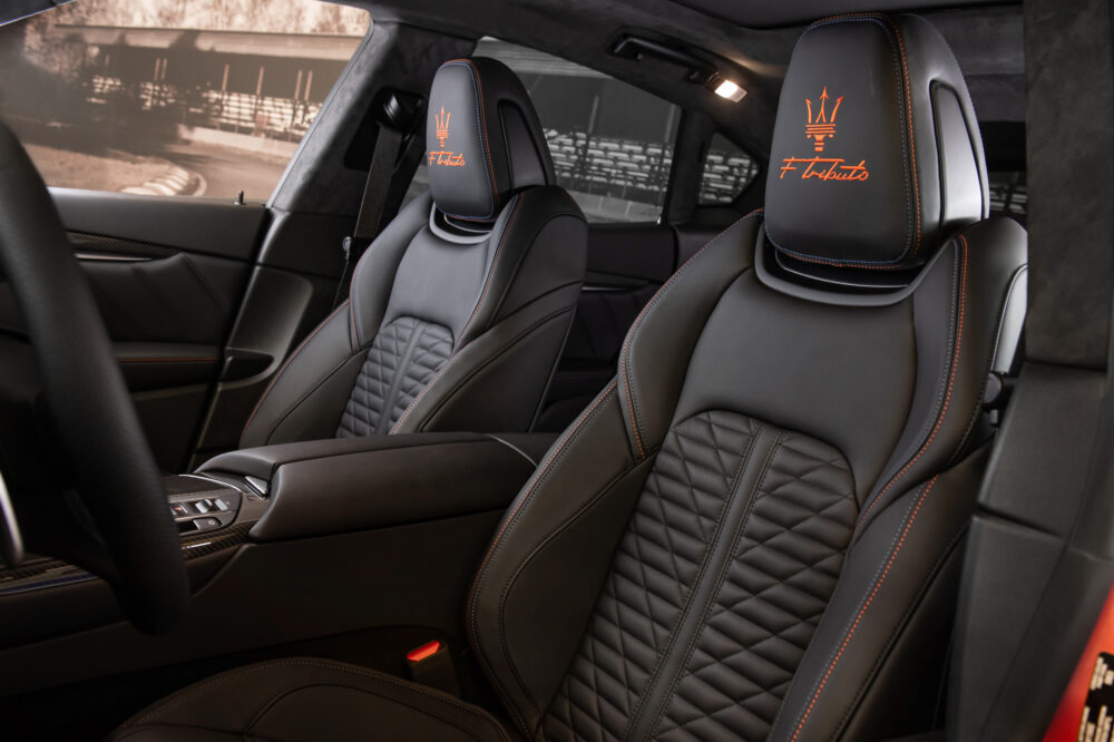 為進一步強化Levante的動感風範,全新Levante Modena S F Tributo特別版配備了21英吋的Anteo啞光灰色輪圈,同時,在輪圈細節上、C柱上的三叉戟Logo以及前方葉子板散熱鰭孔上的車型徽章均採用鈷藍色特殊點綴,彰顯特別版車型與眾不同的身份。而有別於外部塗裝的繽紛色彩,Levante F Tributo特別版的內飾則採用黑色Pieno Fiore奢華全粒面皮革材質,飾以鈷藍色與橙色的對比縫線。