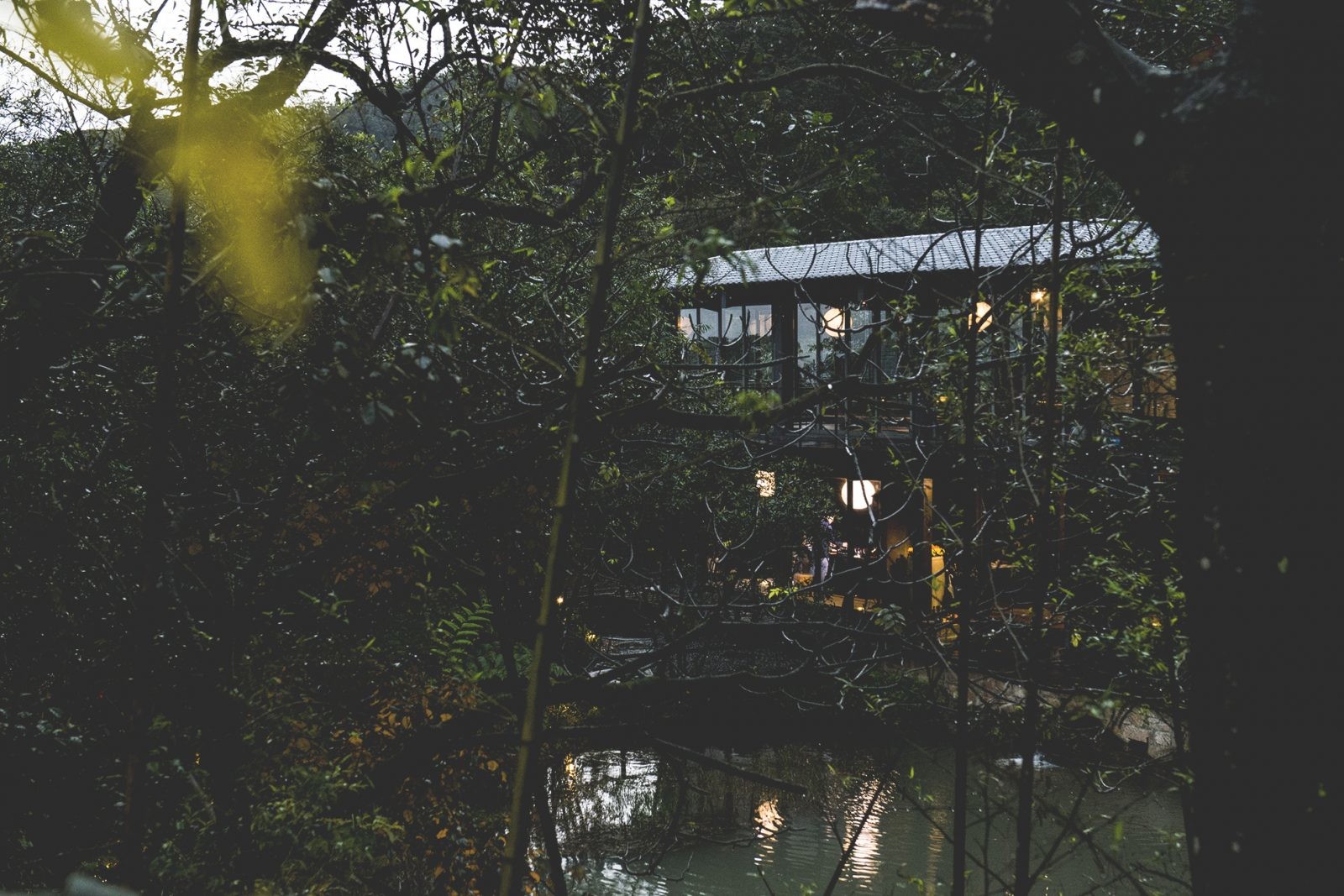 竹林間隱約透出那來自座落在湖上的"六號茶室"的燈火與暈黃,