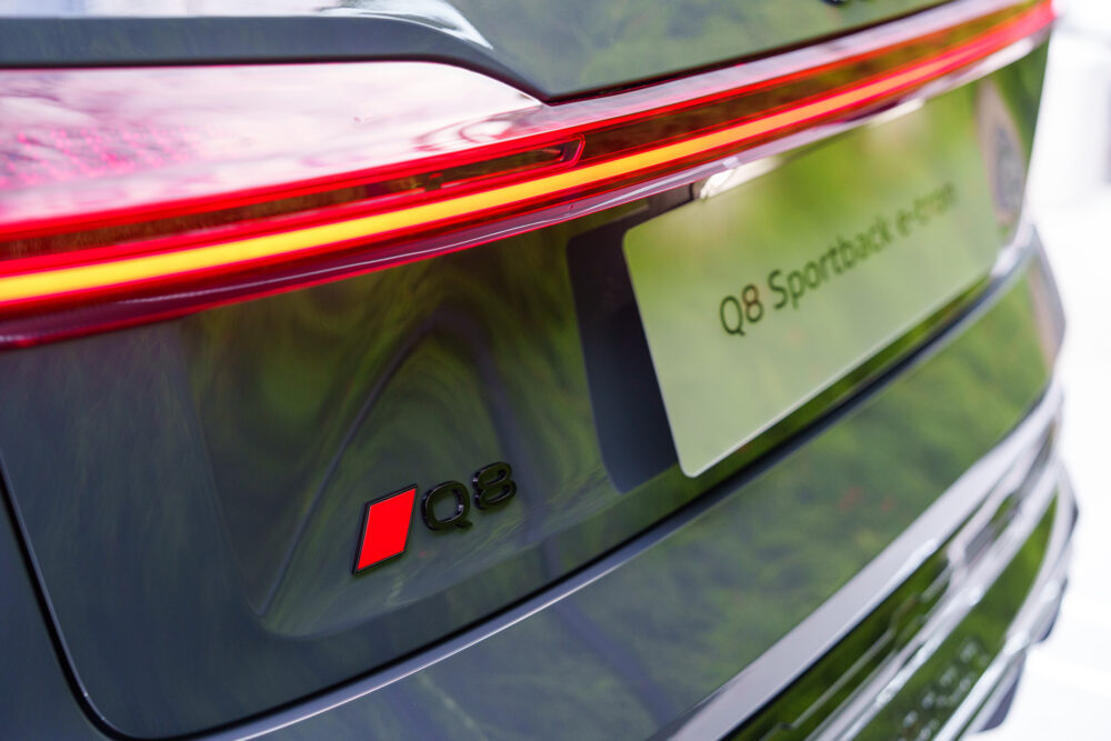 身為首款導入全新品牌識別之作,Audi Q8 e-tron 透過四環全新設計語彙,將其所象徵的「e-volution (電能進化)」思維完美融入其中,展現四環獨到設計美學的精妙之處。全新Audi Q8 e-tron 導入更縝密的空氣動力學造型,前保桿與水箱護罩更整合了符合空氣力學的設計,不僅彰顯家族化的共同基因,更具體體現低風阻車體設計,讓 Q8 Sportback e-tron 的最低風阻達到與房車相同的 Cd 值僅0.24之優異表現。而嵌在車頭正中央、極具視覺張力的品牌logo,透過黑色玻璃底面襯托白色四環線條,以平面二維設計呈現出優雅內斂的高質感;車尾以純黑色烤漆處理的車型銘牌,結合B柱的嵌飾品牌標誌與車型名稱字樣,呈現出充滿現代感的全新品牌識別。