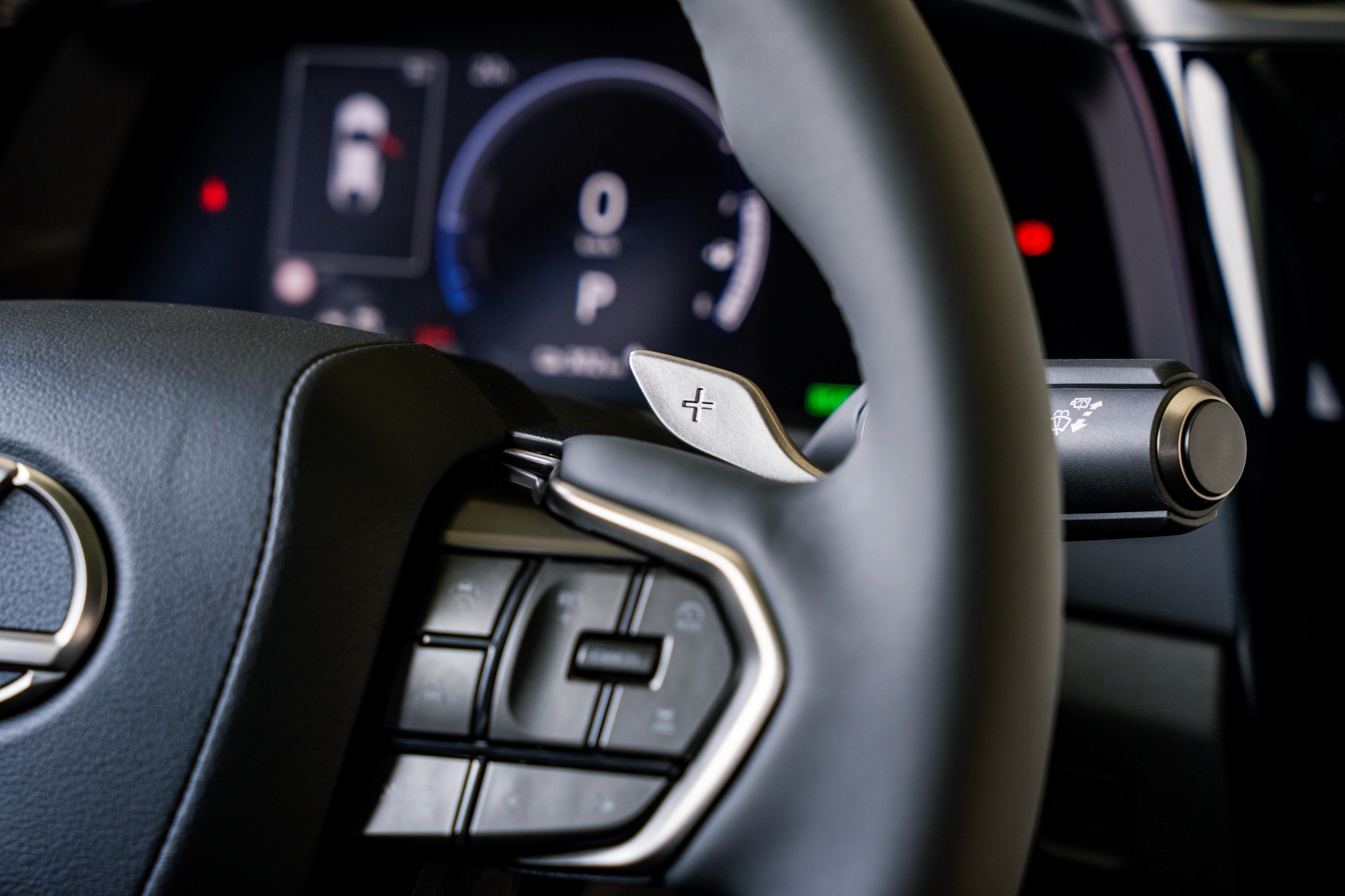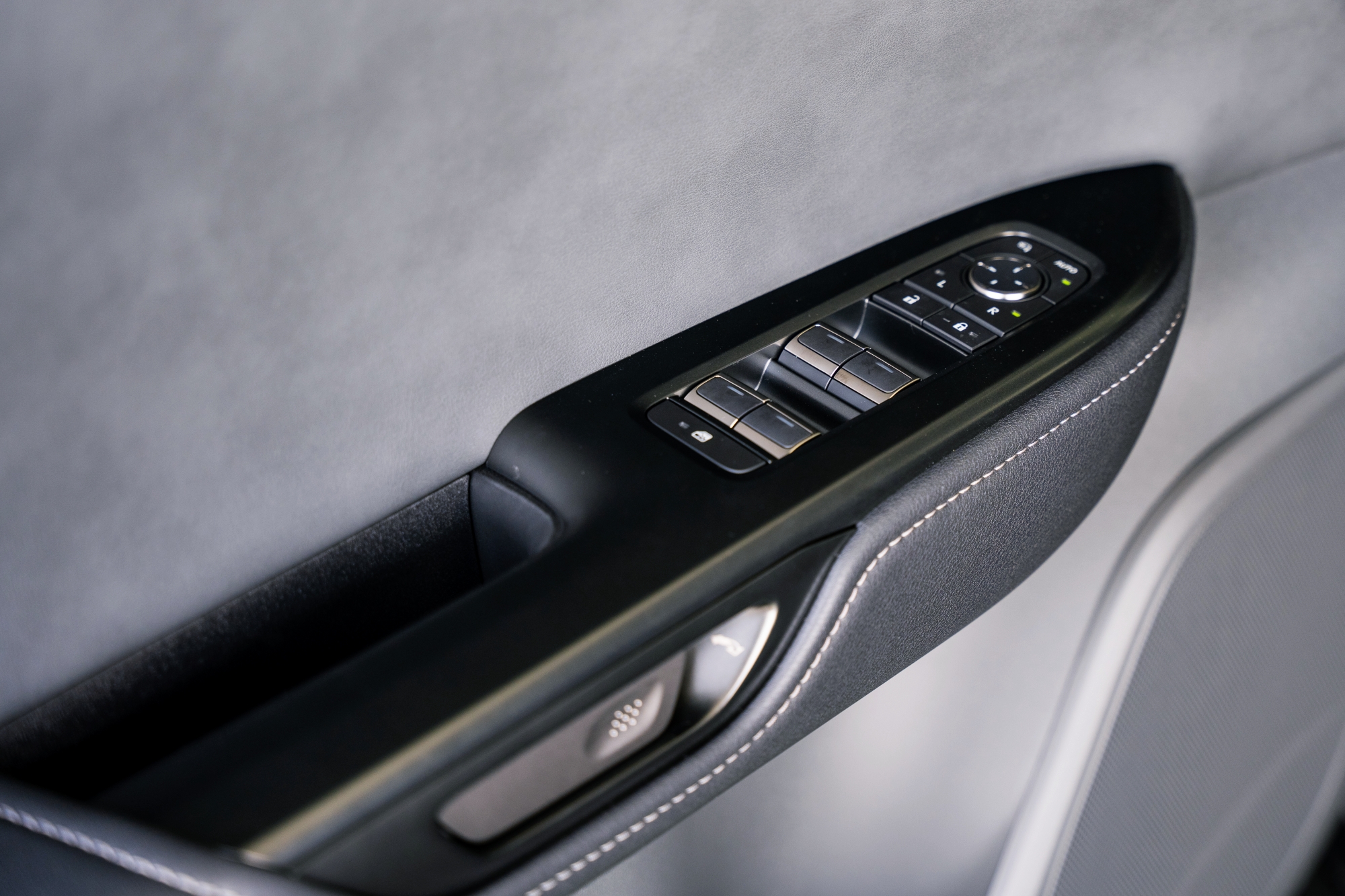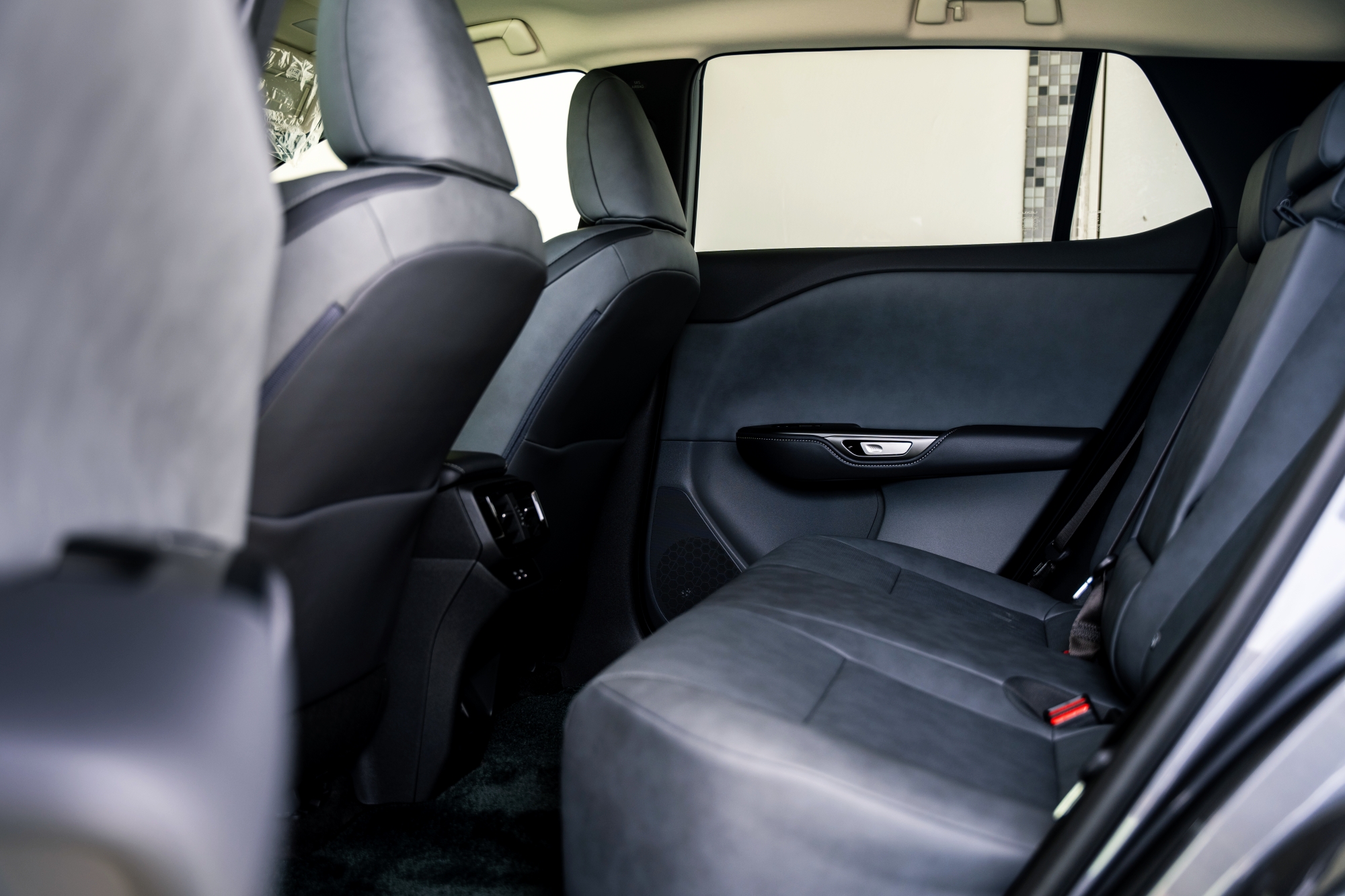 首先RZ的材質應用並沒有問題,相較於兩位孿生兄弟明顯上乘了許多,但卻沒有身為豪華品牌該有的細節,儘管提供了暮灰藍、金耀棕、尊爵黑三種顏色選擇的內裝,但門板在白天日照充足,氣氛燈不明顯的狀態下還是顯得相當單薄,而一整片令人詫異的、平坦的灰色門板,大概是為了投影的需求所致,上面簡約到連個車縫線都沒有。
