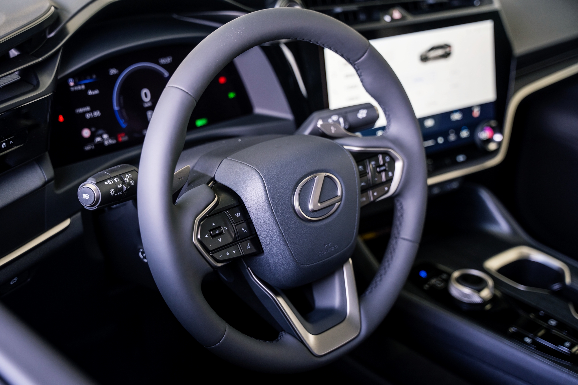 再來就是數位儀表尺寸實在不大,邊緣的黑框佔比也令人無法忽略他的存在,並且也沒有模式切換的功能,雖然中控螢幕依舊挺大的,但仍沿襲自RX車系的介面少了點新意,同時支援Android Auto和無線Apple CarPlay也說不上是值得大書特書的部份,畢竟連60幾萬元的KIA PIACANTO都有;當然,我知道RZ有著孿生框架限制的原罪,不過環顧整個座艙陳設,整體而言沒有令人驚豔的佈局,甚至帶點“bZ味”,用我們的期待來看,整個內裝給出的氛圍感受,除了那個方向盤跟中控螢幕之外,實在感受不到什麼屬於LEXUS的部分…