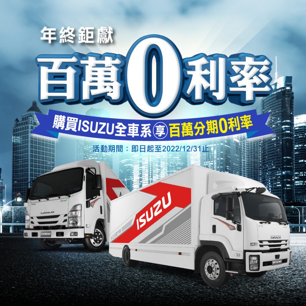 ISUZU台北合眾汽車為了減輕車主朋友們的購車負擔,並回饋所有ISUZU商用車的頭家朋友們,現在起至年底前,推出高額0利率優惠措施,其中N系列車款,享最高100萬分期0利率,F系列車款更可享有高達150萬0利率的優惠方案,想要過年前擁有新車搶業績可不能錯過這波活動!
