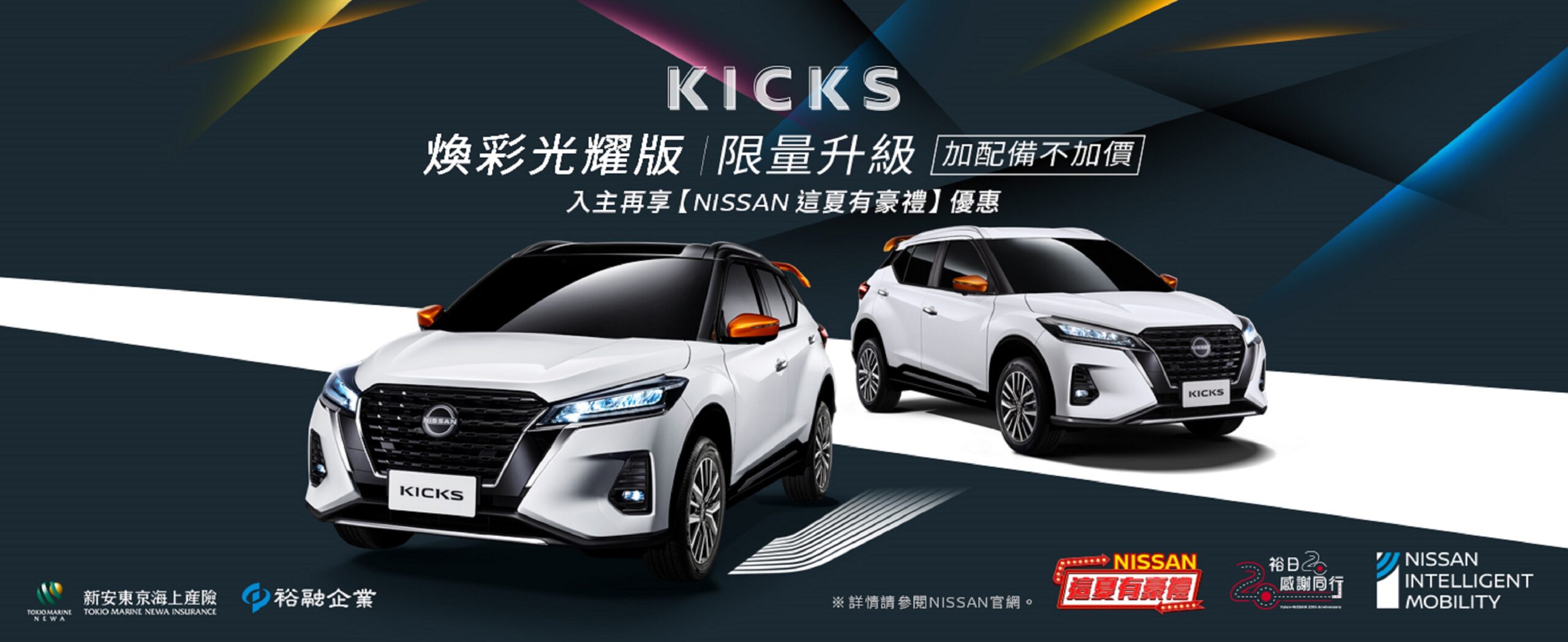 誠摯邀請消費者親臨全國NISSAN展示中心,一同體驗KICKS隨心所馭、智能跑旅的優質產品力,感受NISSAN KICKS「煥彩光耀版」的獨特魅力。相關優惠詳情請洽全國NISSAN展示中心或參閱NISSAN官網http://www.nissan.com.tw/。