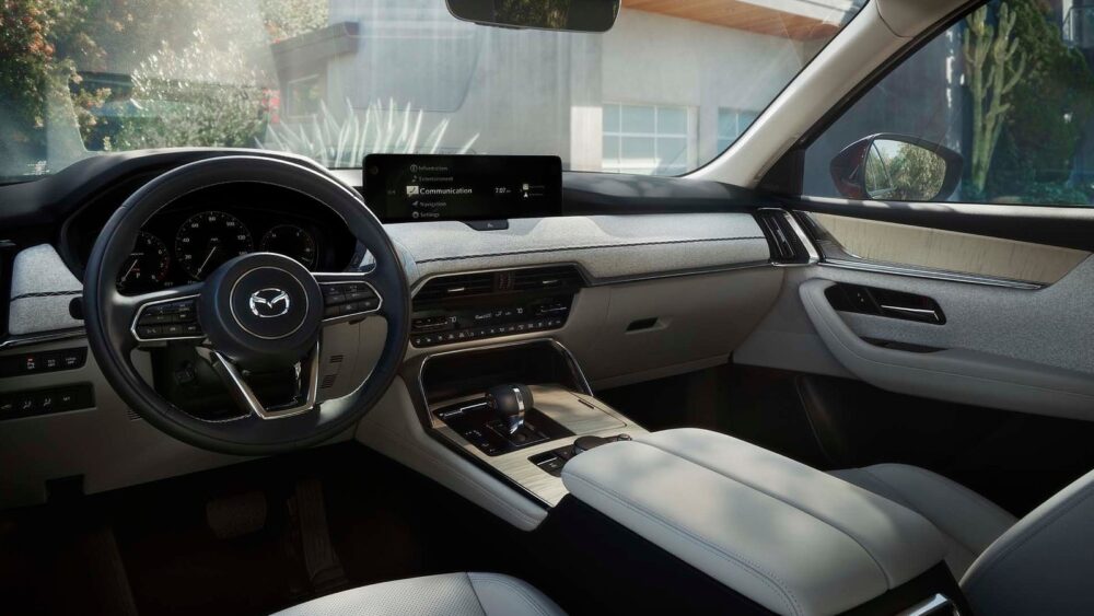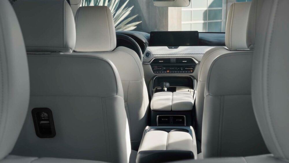 而內裝維持MAZDA一如繼往的高水準表現,以名為「Musubu」的工法打造內裝飾版,是一種源自於「Kumihimo (組み紐)」的日本手工精緻編織技術,並用上皮革、木材、鋁合金等多樣材質讓CX-90擁有更豐富的日式職人工藝精神。提供三排2+3+3、2+3+2、或者是2+2+3、2+2+2的第二排獨立座椅等多樣化設定,第二、三排皆配備USB-C充電孔。