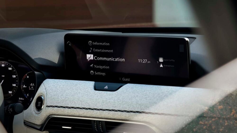 同時搭載新世代12.3吋數位儀表,而12.3吋中央螢幕除了在這個大螢幕內裝的時代中,依然能創造出頗富層次的細膩質感與視覺鋪陳外,更具有See-Through View環景透視科技、電子後視鏡創造優異的駕駛視野,但大部分的操作需透過MZD旋鈕,只有使用Apple Carplay以及Android Auto時可以觸控操作。