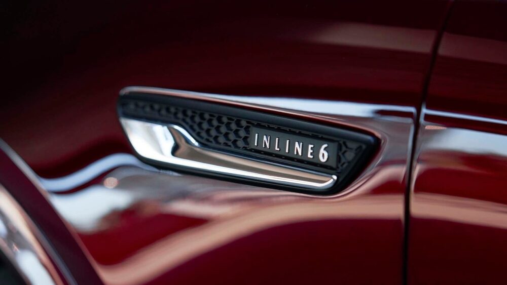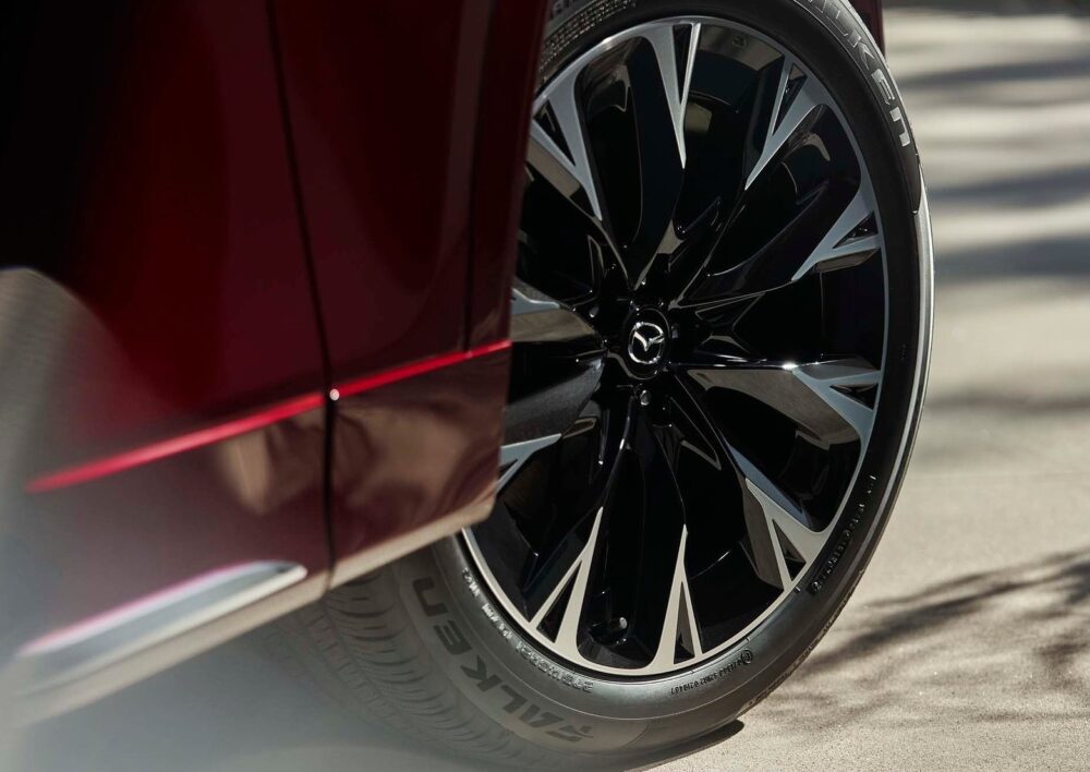 車側方面,葉子鈑處會有標示「Inline 6」、或「PHEV」字樣的銘排來彰顯其動力特色,尤其是那已經幾乎絕跡的6缸,宣示意味確實濃厚。另外,推出新色「工匠紅(Artisan Red)」紀念MAZDA招牌魂動紅(Soul Red)已推出滿10周年,這款新色同時強調更沈穩、卻又更動感的視覺意象和漆面工藝,以MAZDA一向優異的鈑金精度搭配高飽和漆面,成為品牌全新招牌車色。CX-90在也提供最大21吋的金屬切削雙色輪圈。