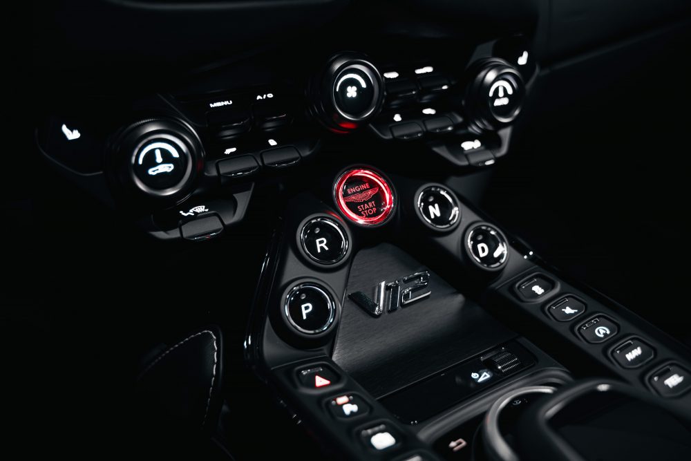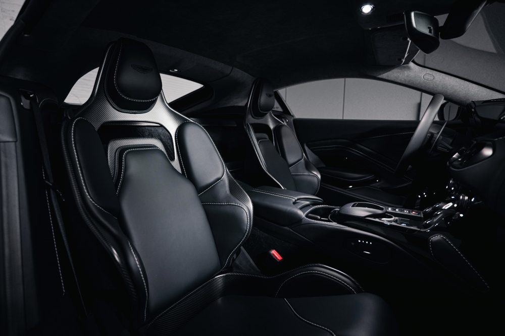 車室空間的配置可選擇用編織皮革或Alcantara材質搭配,中控與車門飾板及控制旋鈕可與車身外觀相互呼應。V12 Vantage保留Vantage車款的經典樣貌標配頂級真皮的Sports Plus座椅,並鑲有品牌飛翼徽飾與網孔造型。車主亦可選配全新碳纖維高性能跑車座椅,配備六向調節功能,提供更佳的座椅支撐性。此款跑車座椅為ASTON MARTIN受賽車運動啟發而打造的專利之作,在不影響乘坐舒適性的前提下,可減輕7.3公斤座椅重量。