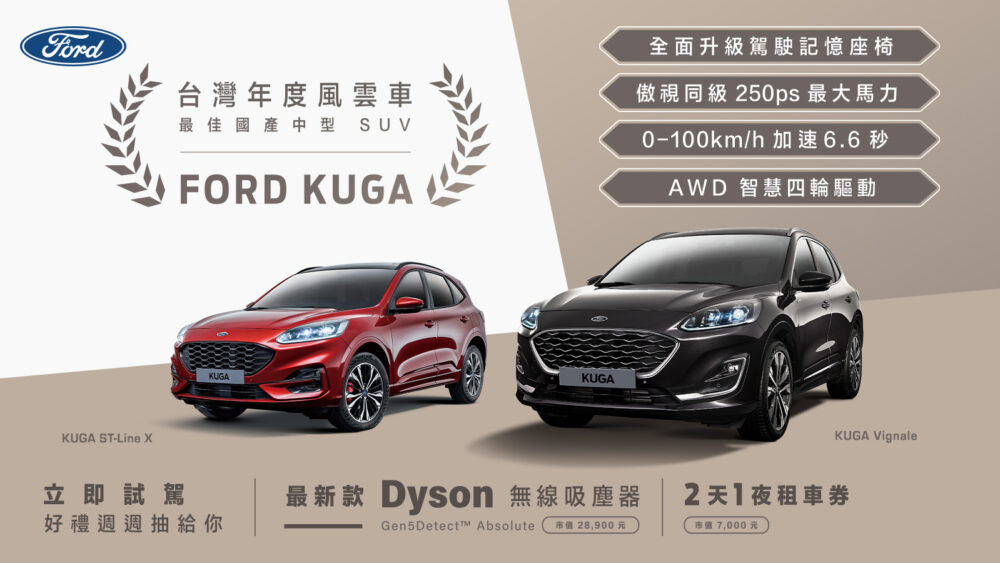 二月底前至Ford全台經銷據點試駕Ford Kuga並上傳至(FB/IG)分享,即享有最新款Dyson無線吸塵器與兩天一夜租車券抽獎資格。