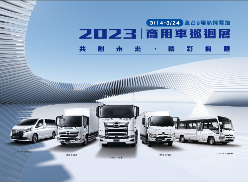 由HINO商用車、TOYOTA商旅車總代理和泰汽車主辦的「2023年商用車巡迴展」活動將於3/14(二)開跑,分別於桃園、台中、台南、高雄、宜蘭、花蓮共8場次巡迴展出各種最新車款,本次展示全新配備HINO六期安規系列車型、功能多樣化的各式完成車、TOYOTA商旅車及大型巴士,期許提供最全方位商品滿足顧客不同事業需求。