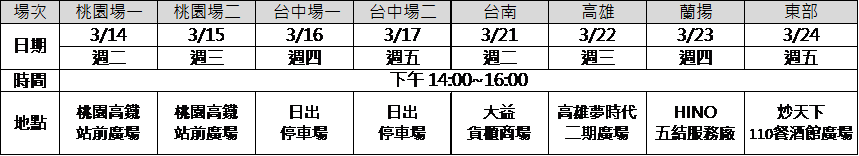 此次巡迴展將展示全新導入的HINO 3.49噸自排長軸框式車型,另有更多多元車款,歡迎各位頭家蒞臨現場賞車。