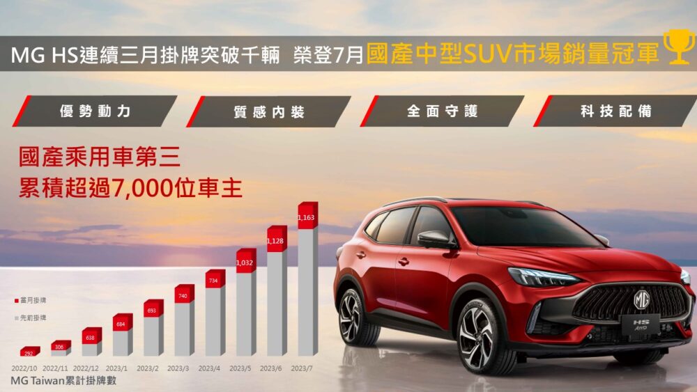 MG憑藉當家休旅HS「超規滿」的產品競爭力,深獲消費者喜愛,在7月份銷售掛牌以1,163輛寫下品牌單月掛牌新高佳績,同時也累積超過7,000位車主,更一舉帶領HS車系搶進國內汽車全市場上半年銷售前十名,除了7月份擠進國產乘用車市場銷量第三名,更拿下7月份「國產中型SUV」單月銷量冠軍!