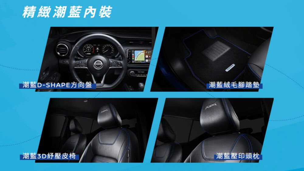 NISSAN KICKS以年輕動感外觀及豐富智行安全配備的優勢,贏得廣大消費者的喜愛,至2023年1月累計銷售已達4,634台,持續穩坐小型跨界休旅冠軍。裕隆日產為感謝消費者的熱愛與肯定,並滿足車主追求與眾不同的個性化需求,即日起推出NISSAN「KICKS潮流版」,以亮眼的白頂狂藍專屬全新車色為基底,再運用強化視覺外型的動感擾流尾翼、酷黑17吋鋁圈及酷黑車頂架,潮藍D-Shape方向盤、潮藍3D紓壓皮椅、潮藍絨毛腳踏墊及精裝壓印頭枕,展現獨特潮流魅力,外觀及內裝極具視覺特色,配備升級不加價,限量推出300台,超值汰舊換新價格81.5萬元起。