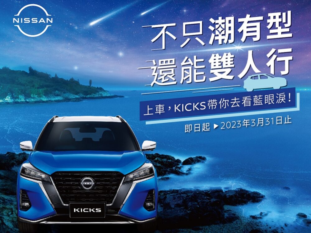 NISSAN為了追求極致的乘車舒適體驗,限時推出「SENTRA / KICKS放大覺」購車優惠專案,即日起至2023年3月31日止,入主SENTRA、KICKS即可免費升級NISSAN精選「全方位聽覺套件組」乙套,包含「JBL聲動揚聲器」與「NSE車艙寧靜工程」,讓消費者能夠在優質的車室空間內享受多層次的音感體驗;再享多重優惠,包含高額分期零利率、舊換新5萬元優先領及68無限里程延長保固,讓消費者能夠輕鬆入主新車,並享受眾人矚目的目光及放大聽覺的駕馭體驗。即日起至2023年3月31日止,凡至NISSAN全省經銷展示中心試乘KICKS,並與KICKS潮流版合照上傳社群媒體(FB/IG)公開分享,即可抽馬祖藍眼淚雙人機票,總計9名幸運得獎者可攜伴一同追淚。