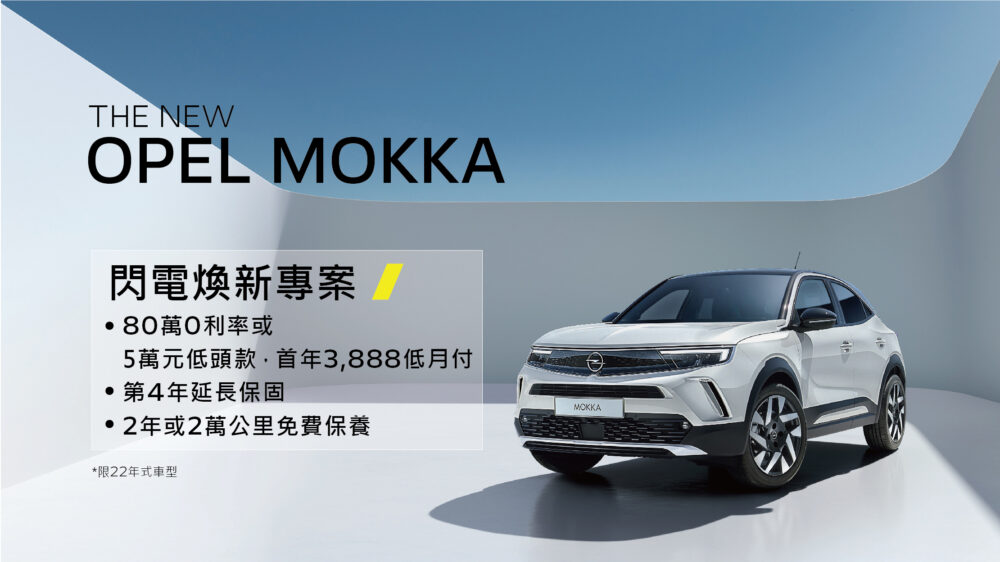 OPEL台灣總代理歐吉汽車感謝消費者的肯定與支持,於農曆年前火速完售OPEL Mokka Edition的亮眼表現,加碼推出OPEL閃電煥新專案,自即日起至2月底前下訂OPEL Mokka Elegance車型,即可享有3+1年不限里程延長保固以及2年或2萬公里免費保養 (共二次免費保養) ,並提供80萬元高額0利率或5萬元低頭款首年低月付3,888元起的彈性財務方案可選擇;此外,入主Mokka-e Elegance車型也可享有3+1年不限里程延長保固優惠,讓嚮往純電移動生活的消費者可以安心入主,享受綠能科技。