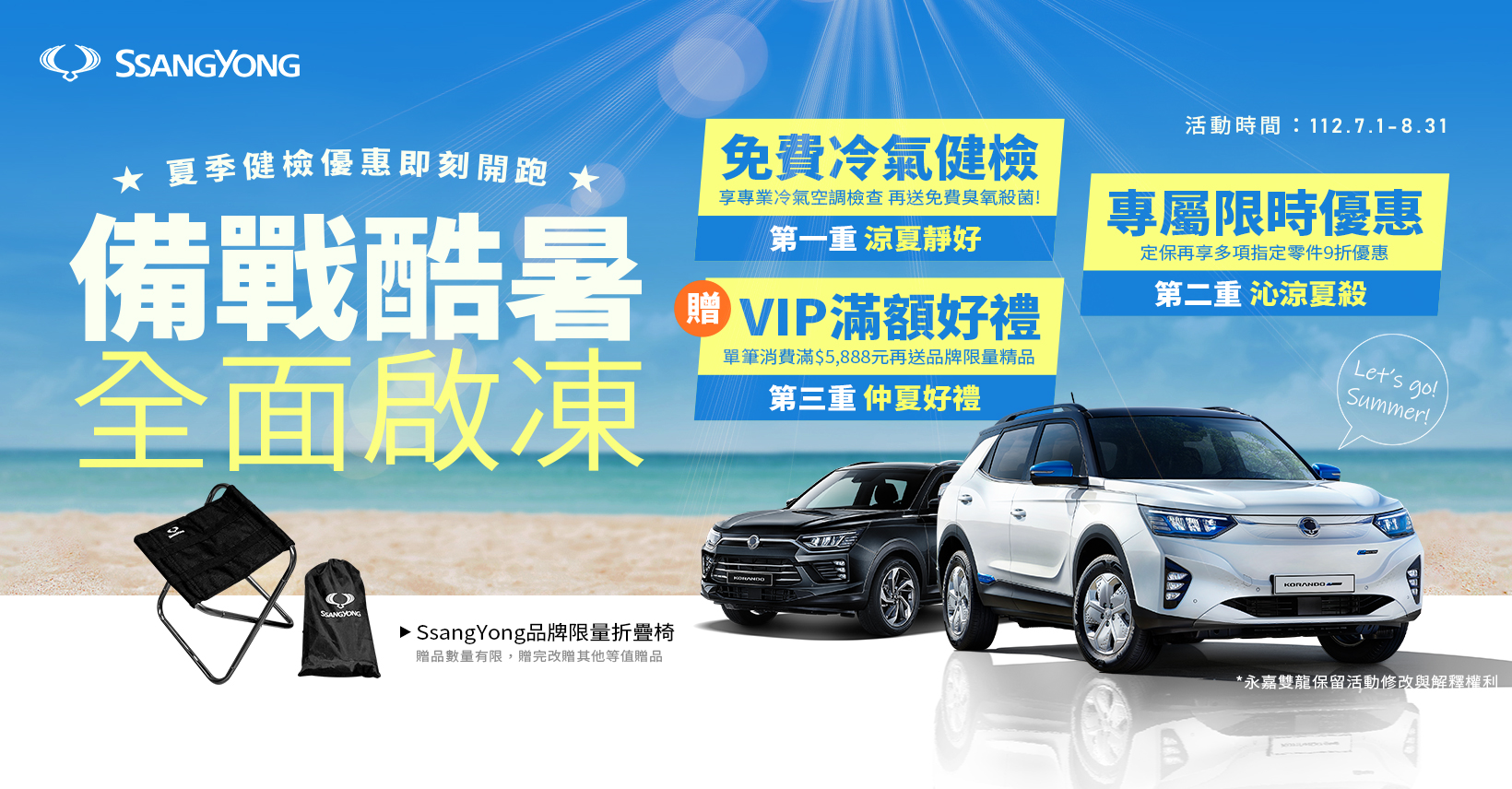 為了提供車主們涼爽舒適的用車環境,SsangYong雙龍汽車於2023年7月1日至8月31日,舉辦「備戰酷暑 全面啟凍」夏季健檢活動,邀請SsangYong雙龍汽車車主回廠做好冷氣空調保養,減輕愛車運轉負擔,一同涼爽迎接充滿陽光的盛夏季節。