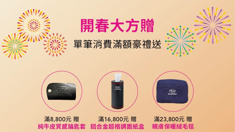回廠再享汽車美容及零配件優惠 伴您出入平安再添新氣象,歲末年終迎新之際,為了讓您的愛車以最佳狀態迎接嶄新的2023年,SUBARU特別推出「SUBARU新春健檢」活動,自2022年12月1日起至2023年1月20日止,凡於活動期間預約返廠,不僅提供全車五大系統共36項免費健檢,更享有精緻車體美容與原廠零配件專屬優惠,單筆消費滿額再贈豪禮。SUBARU期盼以最專業、用心的服務,讓每一位車主享受安心與愉悅的精彩旅程。