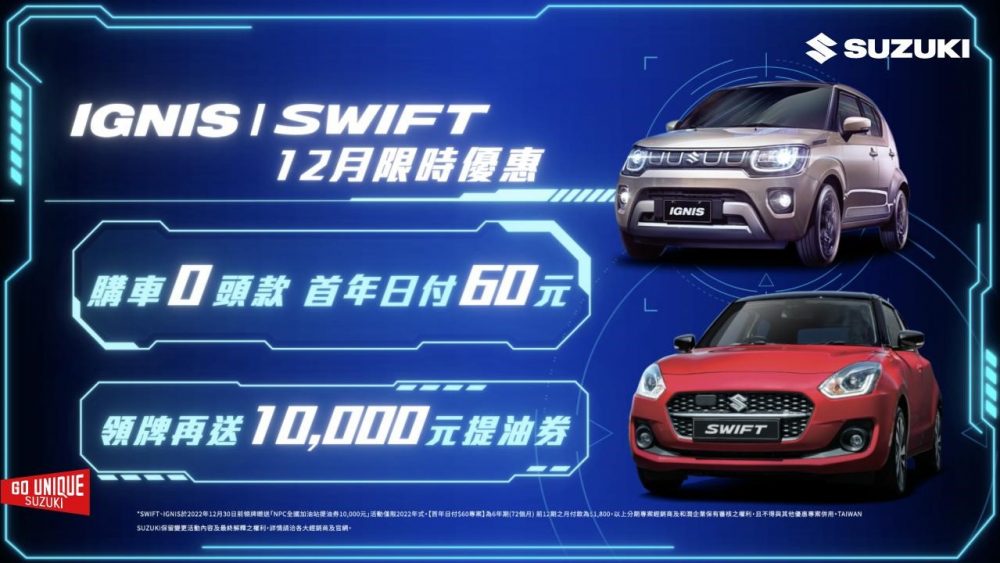 歲末年終將至,TAIWAN SUZUKI為了回饋廣大車迷一直以來的支持愛護,優惠好禮最後加碼!12月底前領牌贈NPC全國加油站提油券10,000元,還可享『代車險』及『不限里程道路救援』!各車款專屬優惠不間斷,SWIFT車系、IGNIS「首年日付60元專案」、VITARA車款享「60萬30期0利率」、CARRY力挺頭家「分期免頭款,首年0負擔專案」等多種購車優惠方案讓你輕鬆入主無負擔。來店賞車送SUZUKI專屬滑鼠墊,試乘再送SUZUKI專屬摺疊傘,快點把握最後機會至各大經銷展示中心賞車試乘!