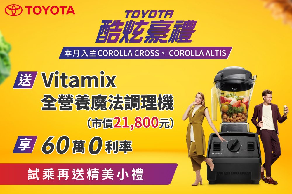 為感謝消費者長久以來的愛護與支持,TOYOTA台灣總代理和泰汽車於12月推出「TOYOTA 酷炫豪禮」限時優惠活動:本月入主COROLLA CROSS、COROLLA ALTIS,就送美國百年精品品牌Vitamix「全營養魔法調理機」(型號E310,市價21,800元),讓消費者入主好車的同時也能輕鬆百變各式美食,從駕馭樂趣到料理樂趣,更能盡情享受精彩酷炫生活。