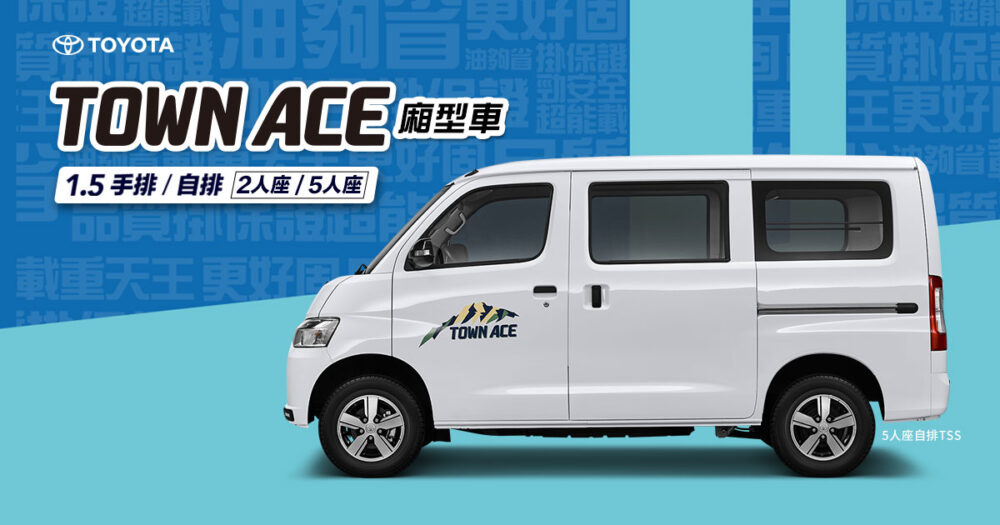 TOYOTA TOWN ACE之所以能夠熱銷的原因歸功於在載重、空間、油耗表現、安全防護以及後勤保固都能滿足需求。貨卡車型最高載重960公斤,搭配超大貨床面積,各行各業的貨品都能以超高效率承載,深獲批發零售、自營商、貨運、青年創業等頭家的不斷好評,適中的車身尺寸與靈巧迴轉半徑,自由無負擔地穿梭在各地街頭巷弄。平均油耗表現高達15.2km/L(自排版本) 、14.8km/L(手排版本) ,讓消費者不僅省油錢更能賺大錢!安全配備的部分除了全車系標配雙SRS氣囊,頂規車型更搭載TSS (Toyota Safety Sense) 主動安全防護系統,全方位守護乘駕安全。