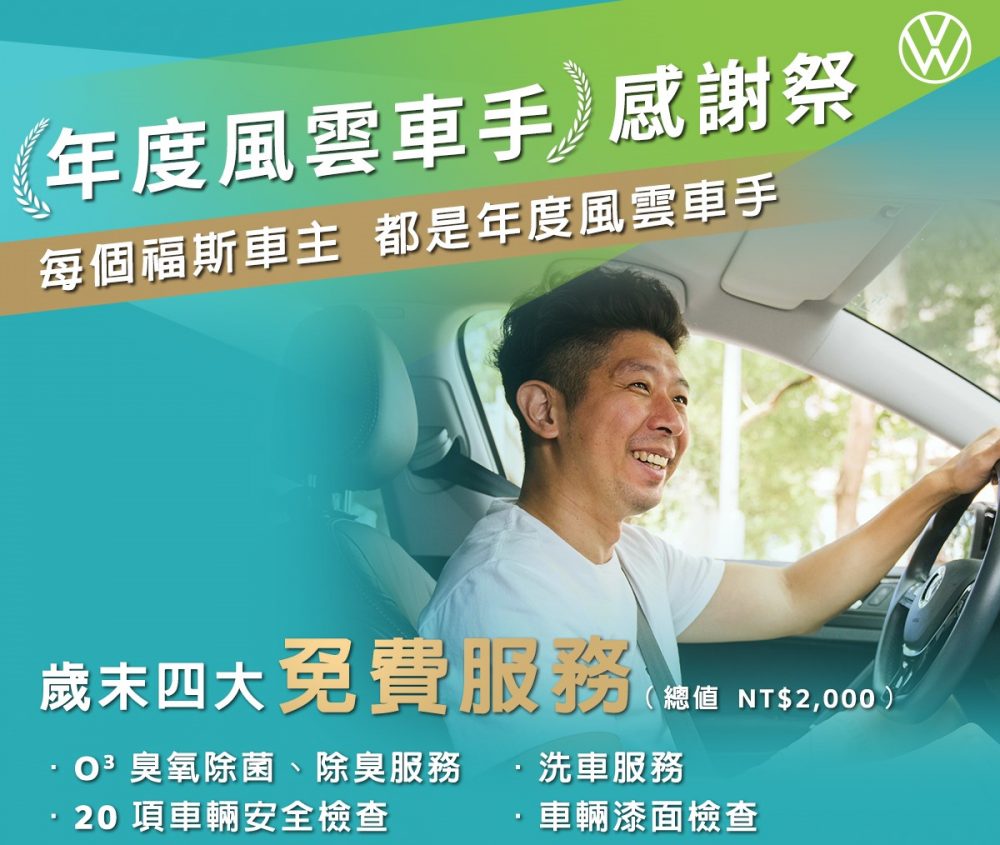 Volkswagen「年度風雲車手」感謝祭正式啟動,自2022年12月1日至2023年1月31日止,車主回廠健檢或不限金額消費,即贈「Volkswagen 年度風雲車手」車貼,車主更可使用My Volkswagen®全新功能「線上預約保養」先行預約,同時獲得歲末四大免費服務(價值2,000元),含多達20項車輛安全檢查、O 3 臭氧除菌與除臭、專屬洗車和車輛漆面檢查。