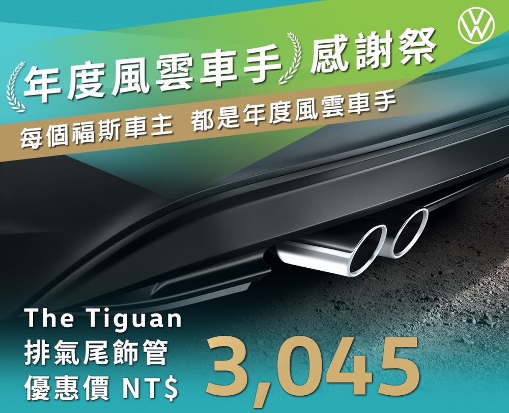 指定原廠保養維修零件8折起(包含引擎機油)和米其林輪胎買3送1,再加碼原廠配件精品優惠7折起,包括車頂行李箱、動態輪圈蓋、The Tiguan 排氣尾飾管與其他原廠精品,打造福斯人風格生活。